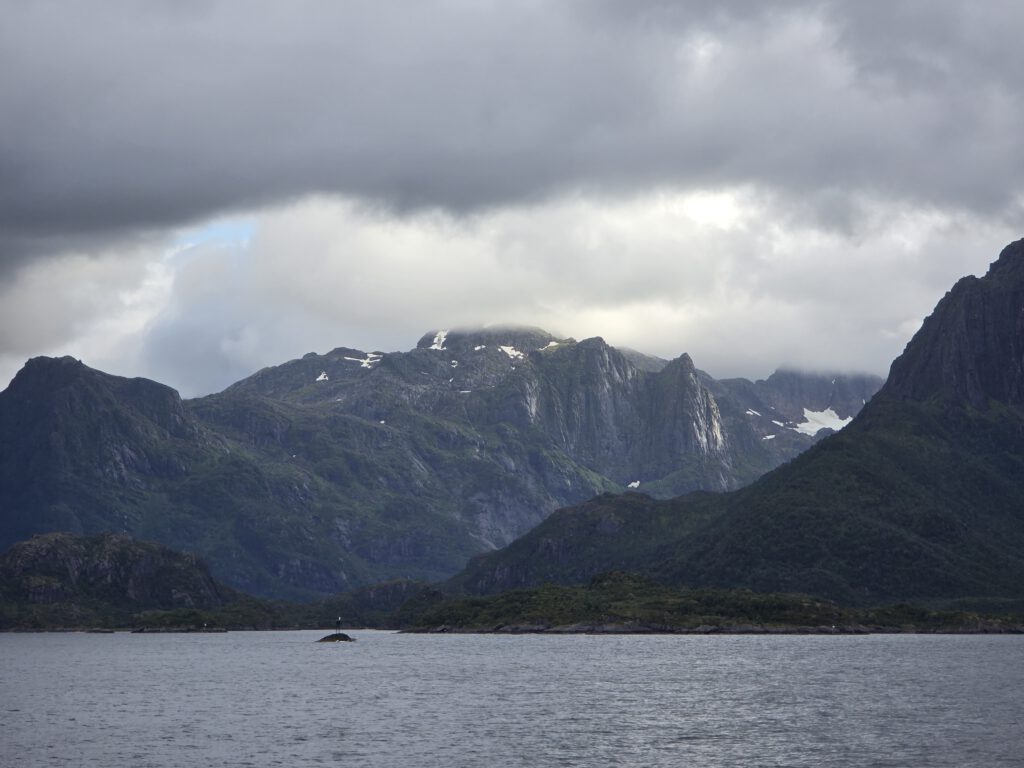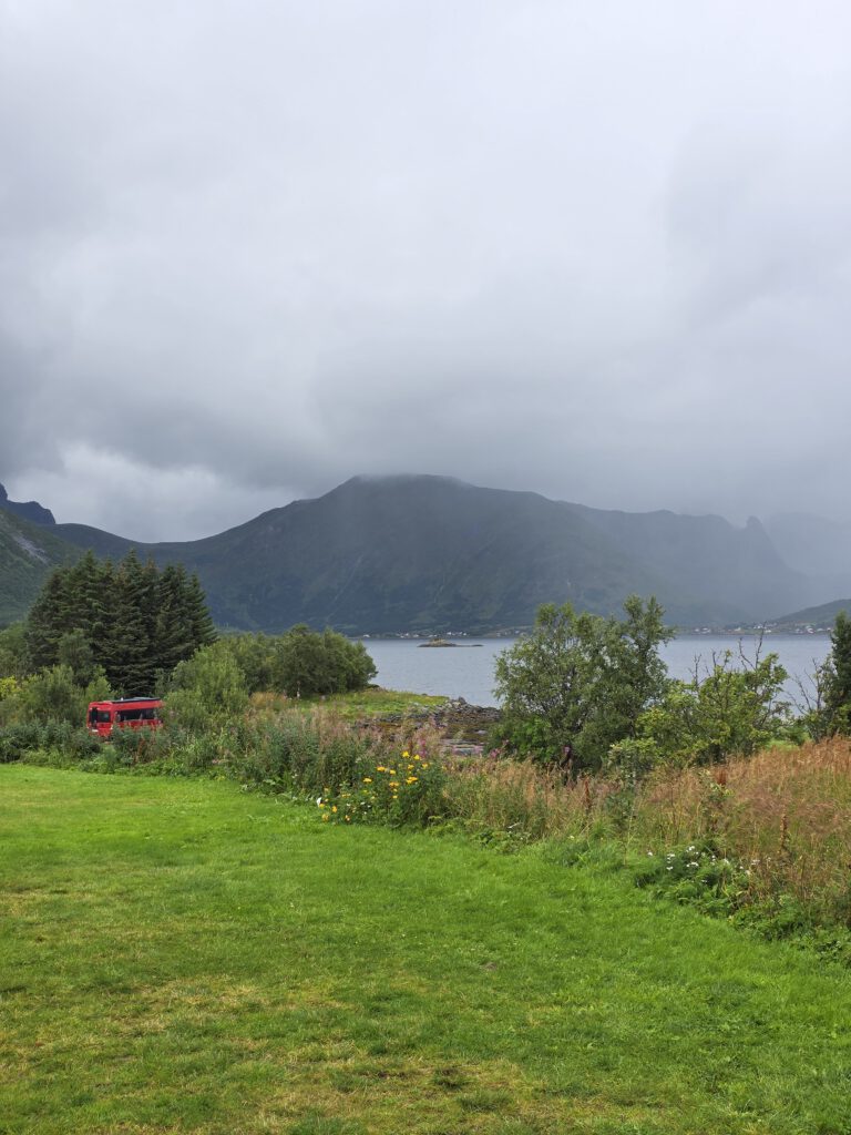 Auch in dem koseligen Mormors, ein Café in Stokmarknes, lassen wir es uns gut gehen. In dem dort befindlichen „Hurtigrutemuseet“ besuchen wir die Museumsbutikken, ohne Buch komme ich da aber nicht raus. Gezeigt wird in dem imposanten Gebäude die MS Finnmarken. Mit der Fähre in Melbu verlassen wir die Vesterålen und landen in Fiskebøl auf den Lofoten an. Auf dem schön gelegenen Sildpollnes Sjøcamp stimmen wir uns auf die nächsten Tage ein.