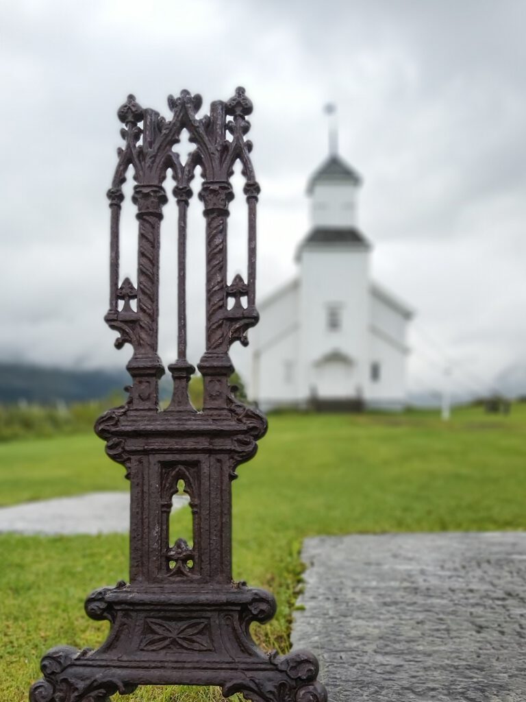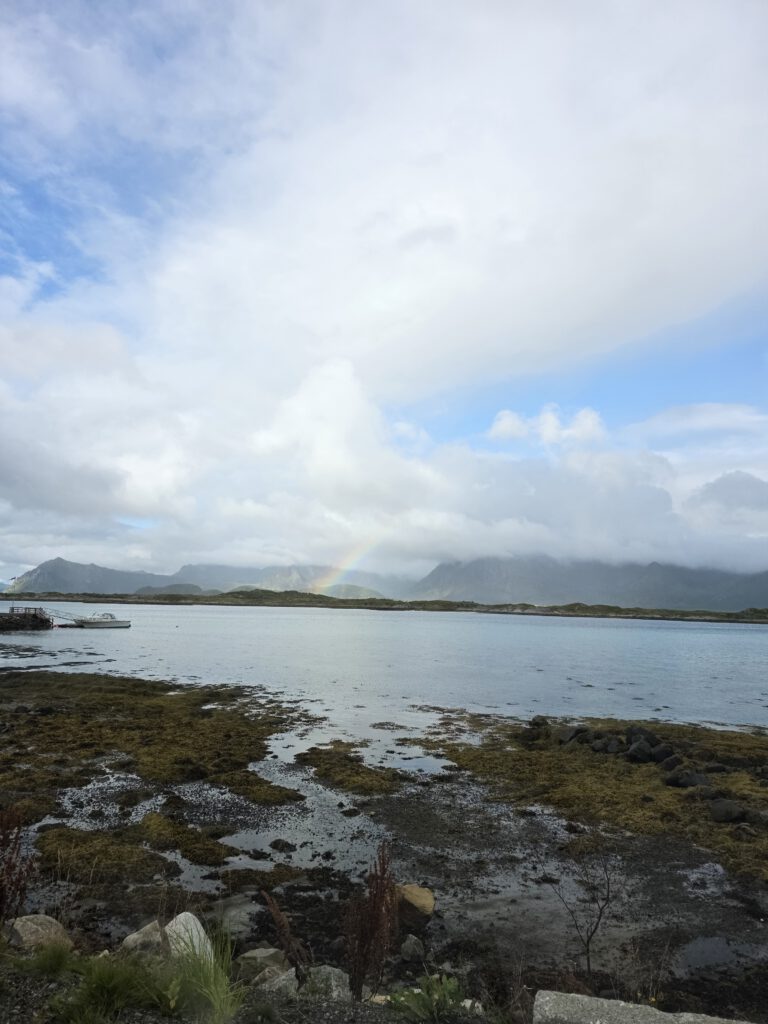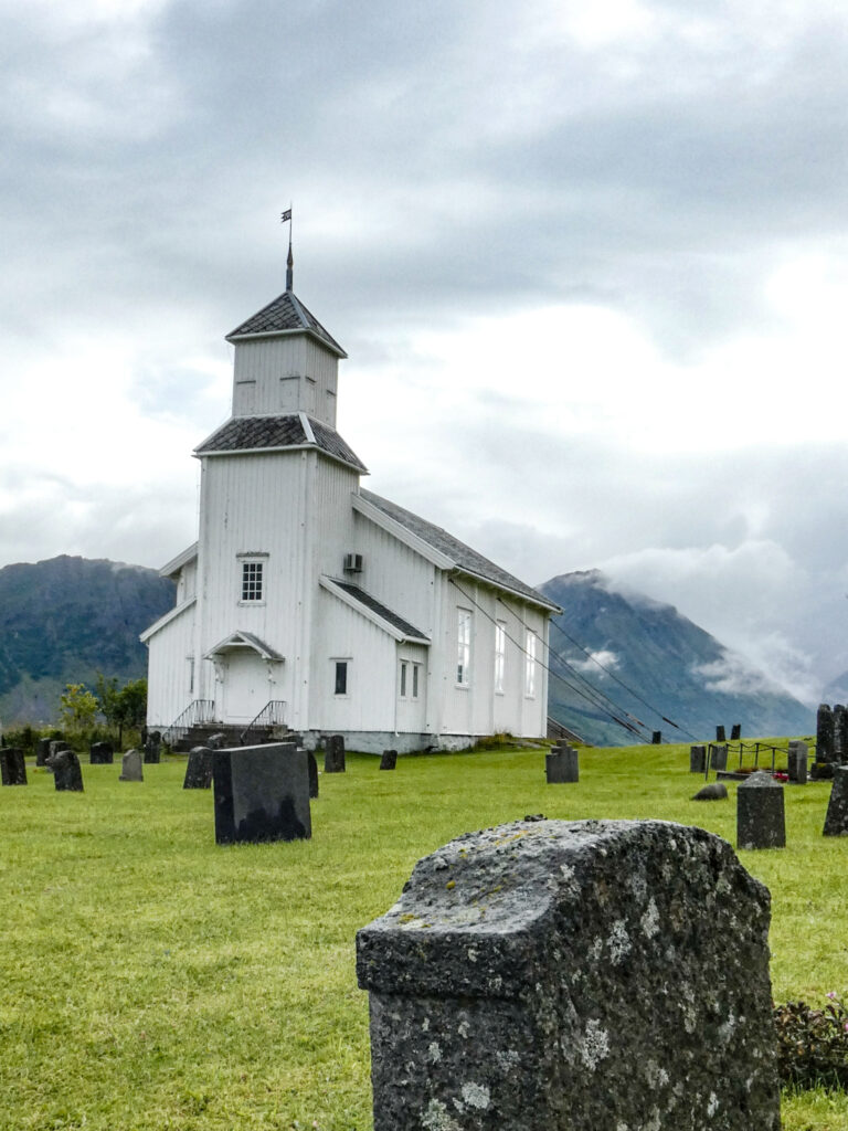 Wir haben uns daher entschlossen auf der Panoramastraße den nördlichen Teil der nächsten Lofoteninsel, Gimsøya, zu umfahren. Der ganz in Weiß gestrichene Holzbau der Gimsøy Kirke liegt idyllisch direkt am Strand. Windseitig wird sie durch vier massive Eisenabspannungen festgehalten. Die Grabtafeln bezeugen Einzel- und Familienschicksale, uns ist aufgefallen, dass für Frauenvornamen sehr häufig männliche Vornamen feminisiert wurden, ein Beispiel, Kaspara.
