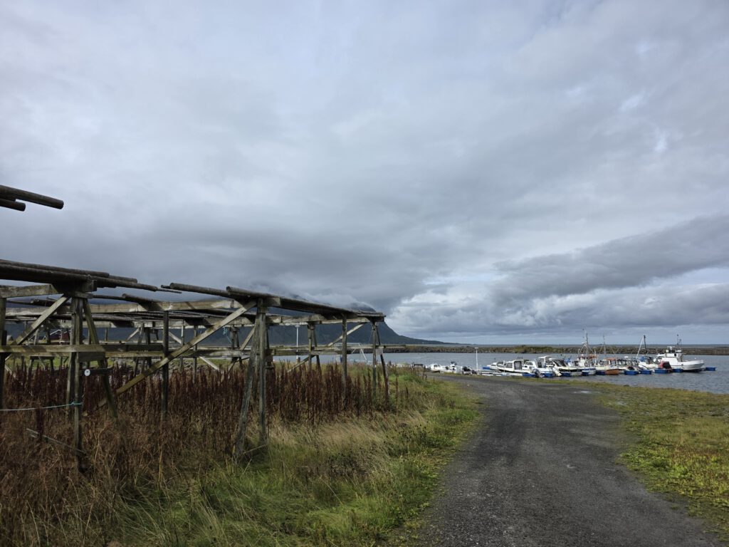 Am Nordende von Gimsøya, liegt Hovsund, eine Ansiedlung mit vielleicht zehn Häusern, einem geschützten Hafen und ausgedehnten Skrei-Trockengestellen. Da kann man sich vorstellen wieviel Skrei in der Fangsaison alleine in diesem kleinen Hafen angelandet werden muss um diese Trockengestelle zu befüllen.