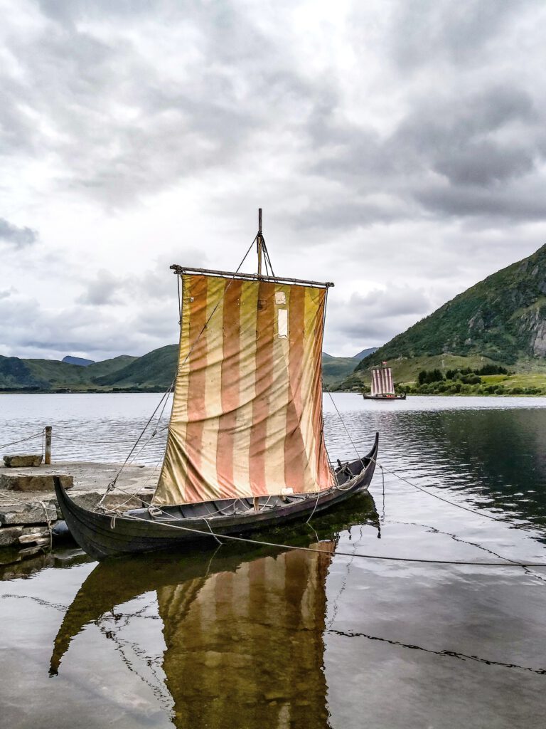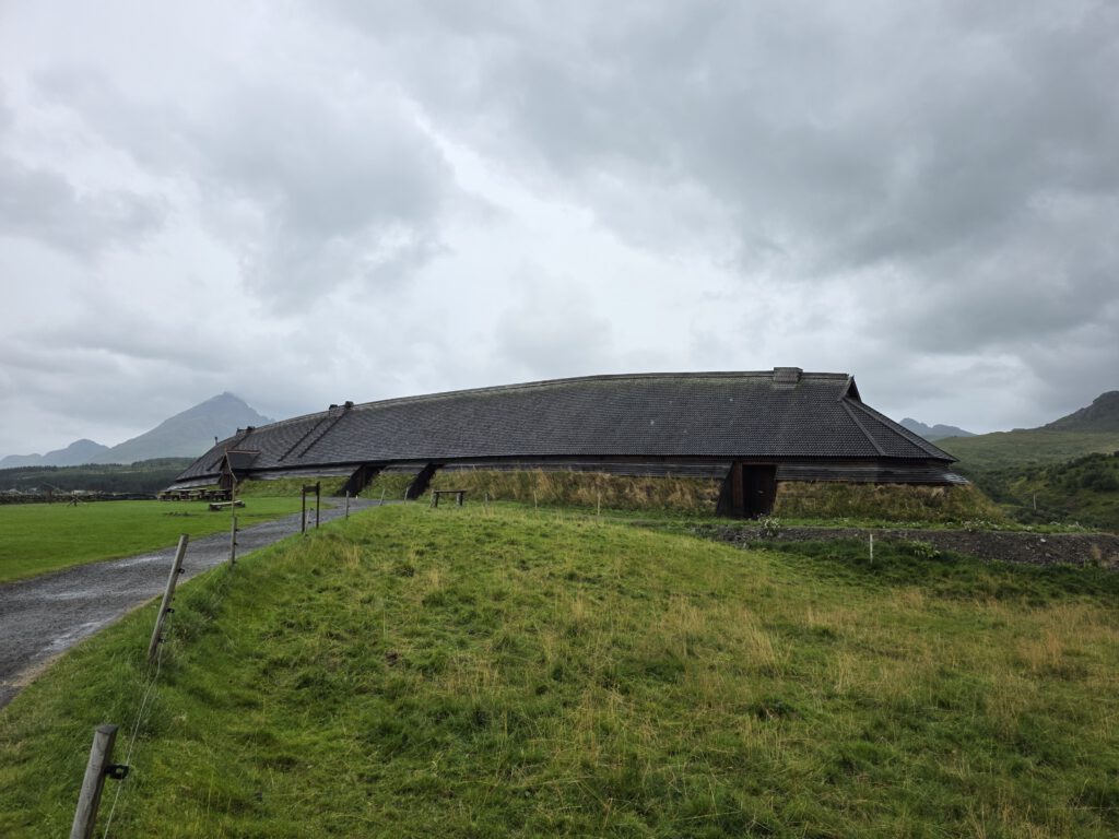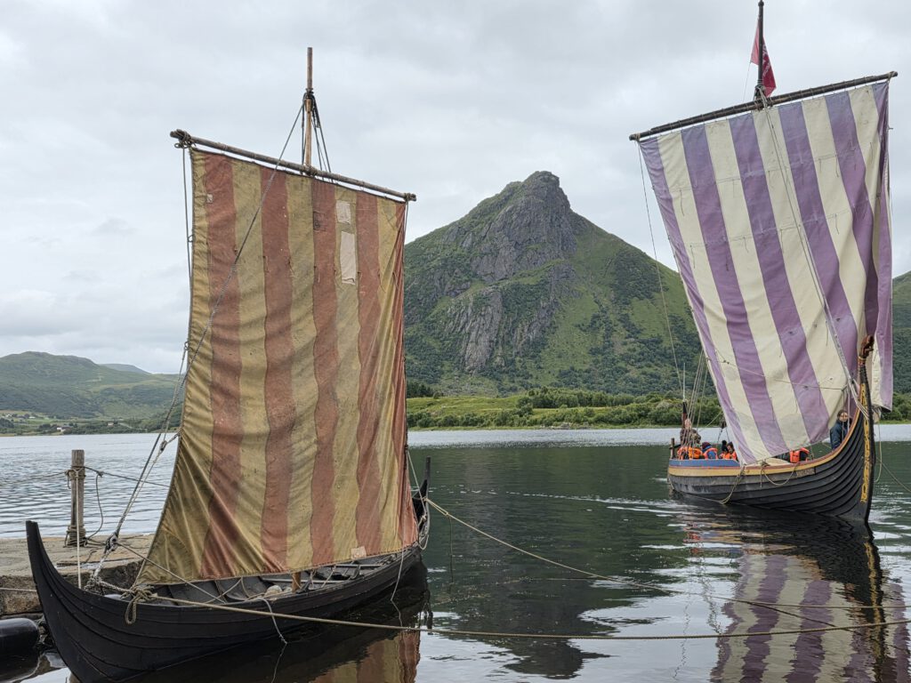 Vestvågøya ist die nächste Lofoteninsel, der ursprüngliche Name war Lofotr, nur für diese Insel. Wir besuchen in Borge das „Lofotr Vikingmuseum„, eine imposante Rekonstruktion des dort entdeckten, mit 87 Metern, bisher größtem bekannten Wikinger-Langhaus. Übrigens wusstet Ihr, dass man in ganz Skandinavien nur drei Eisenhelme aus der Wikingerzeit gefunden hat? Einen in Norwegen und zwei in Schweden und natürlich ohne Hörner! Bei einem kurzen Segeltörn auf einem Wikingerschiffnachbau durften wir uns kurz auch als Wikinger fühlen.
