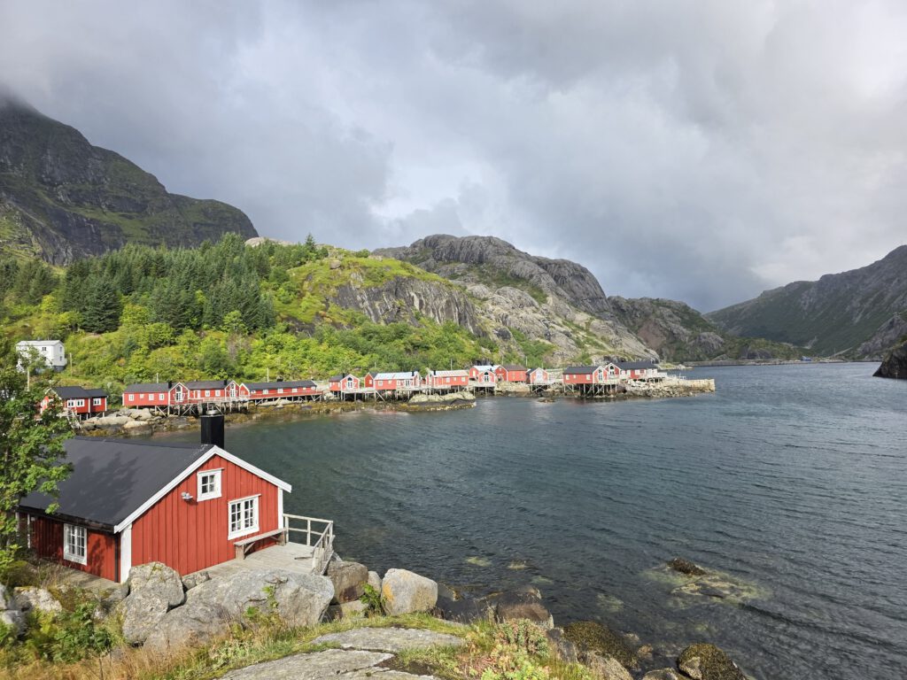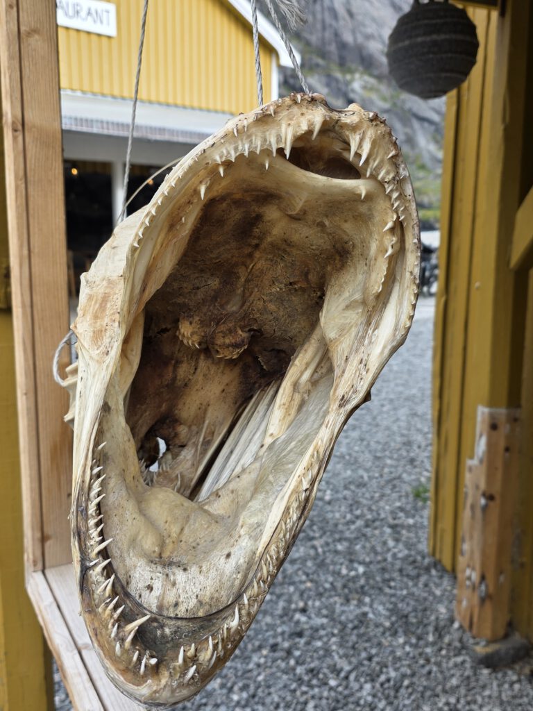 das charmante und fotogene Fischerörtchen Nusfjord haben wir heute besucht. Die pittoresken roten und gelben Häuser auf Stelzen haben das Lofotenimage nachhaltig geprägt. Also suchen auch wir fleißig nach Motiven. Eine erste Stärkung gibt es dabei in der Hansines bakeri. Nach einer Wanderung zum Nusfjord Fyr über Stock, Stein und aufgeweichte Wiesen belohnen wir uns im Landhandleriet Café. Alleine die Einrichtung ist schon einen Besuch wert. In der Trandamperiet informiert uns ein kurzer Film über die Geschichte der Skrei-Fischerei. Die Orte die heute als romantische Idylle wahrgenommen werden, waren Orte des nackten und unbarmherzigen Überlebenskampfes.