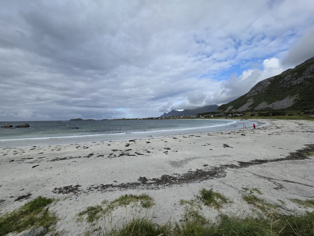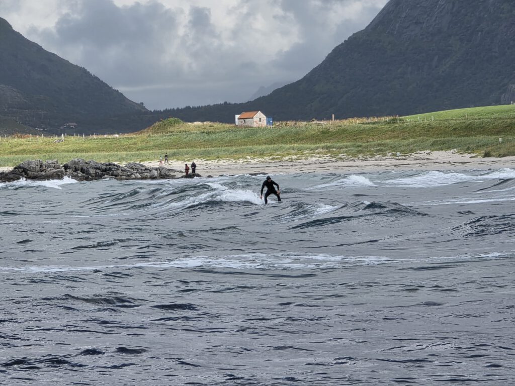 Nachdem wir gestern Unstad besucht hatten, ging es an den weiteren Surfhotspots der Lofoten, Flakstad und Ramberg vorbei. Morgen wollen wir den Ryten/Kvalvika Trail laufen und stehen daher in Innersand bei einem Bauern der für ein paar norwegische Kronen am Trailbeginn Stellflächen zur Verfügung stellt. Highlight ist aber, dass in dem Talabschluss neben den Stellplätzen sehr leckere frisch gemachte Holzofenpizza angeboten wird, einfach nur lecker!