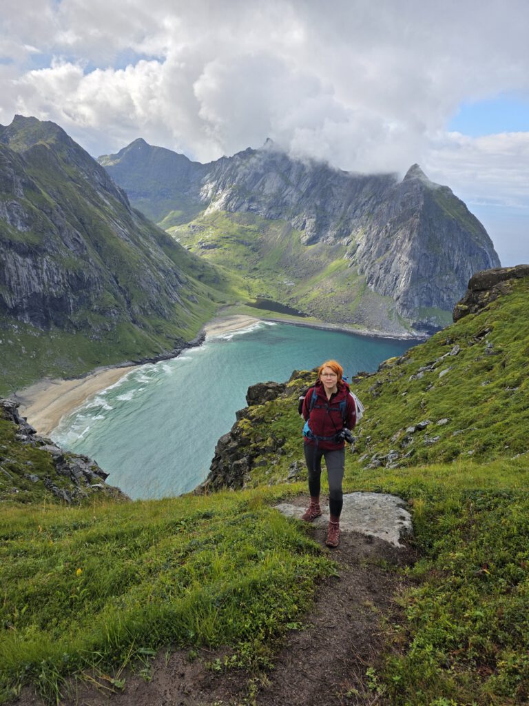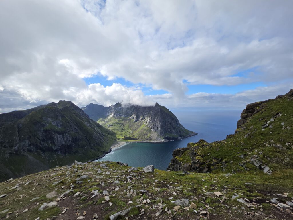 Nach knapp zwei Stunden standen wir dann auf dem 543 Meter hohen Ryten und genossen den Ausblick auf den Kvalvika Beach und das Panorama um uns herum. Die Anstrengung wurde belohnt. Auf dem Rückweg waren wir zwar etwas schneller, aber es war nicht minder anspruchsvoll.