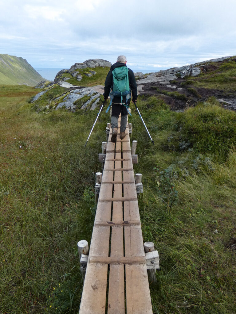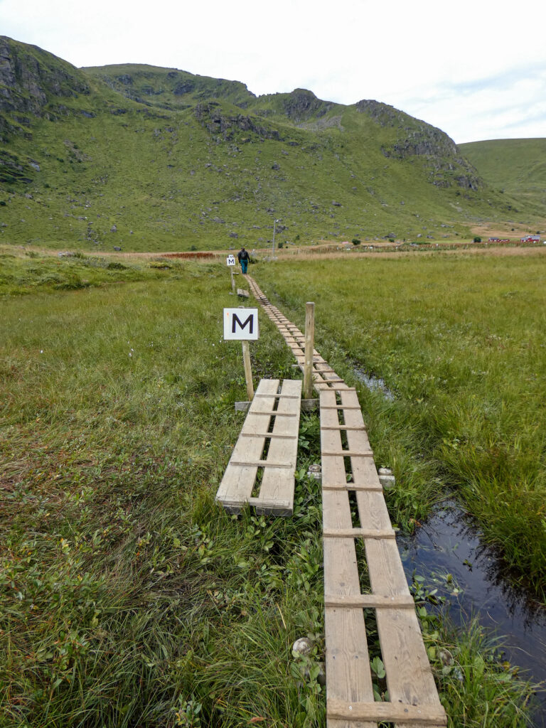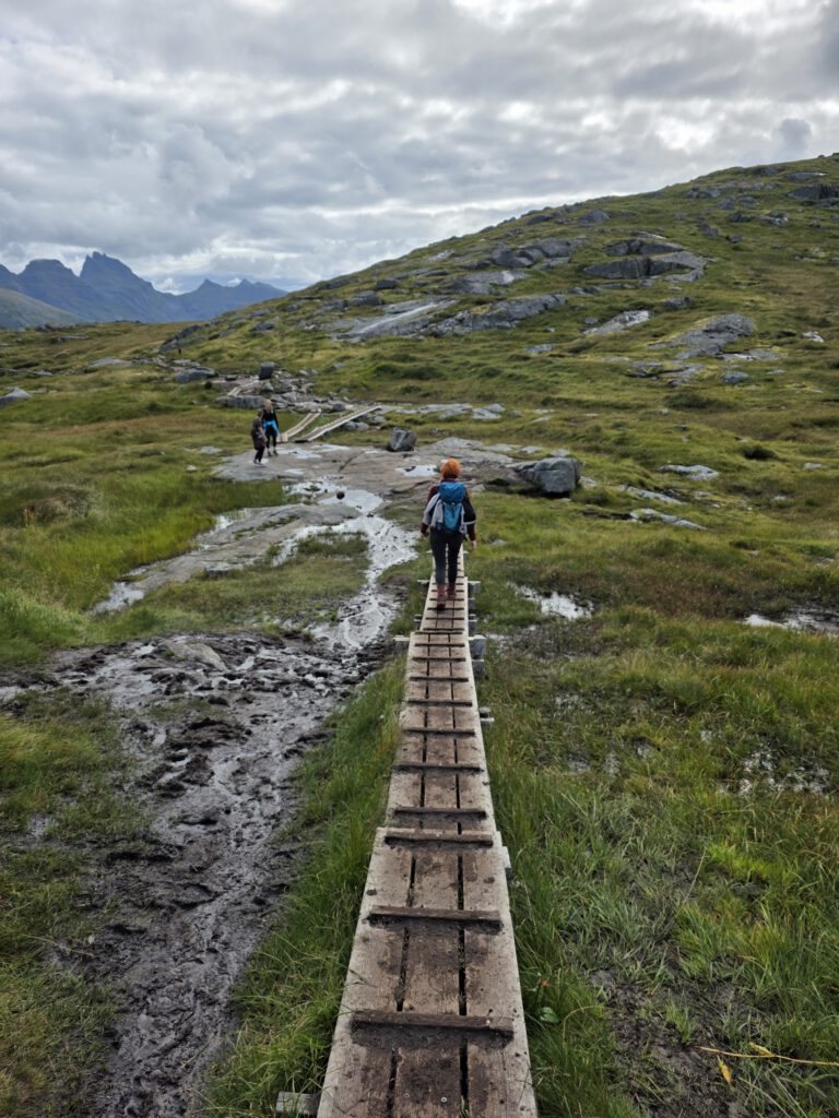 Einheimische sollen anderen Lofotenbesuchern gesagt haben, der Aufstieg zum Ryten sei „kinderleicht“. Wir wissen nicht was für Kinder die Norweger großziehen. Wir fanden die heutige Tour jedenfalls nicht leicht. Bedingt durch den vielen Regen der letzten beiden Wochen waren viele Teilstücke des Weges sehr nass, bzw. standen förmlich unter Wasser und waren extrem matschig. Dabei sind schon längere Abschnitte nur über einspurige Bohlenwege – mit Ausweichbuchten für Entgegenkommende, so wie auf den engen Landstraßen – zu begehen.