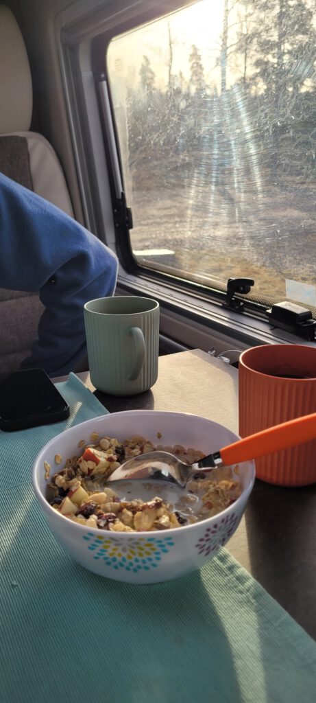 Wie erwartet haben wir gut geschlafen, nicht gefroren und unser Schlafdefizit wieder verringert. Das Frühstück konnten wir sogar bei etwas Morgensonne genießen. Der längste Routenabschnitt von etwas mehr als 500 km stand heute auf dem Plan. Bei den zulässigen Geschwindigkeiten außerorts von meist 80 km/h sind das etwa 7 Stunden. Wir fahren den Inlandsvägen nach Norden.