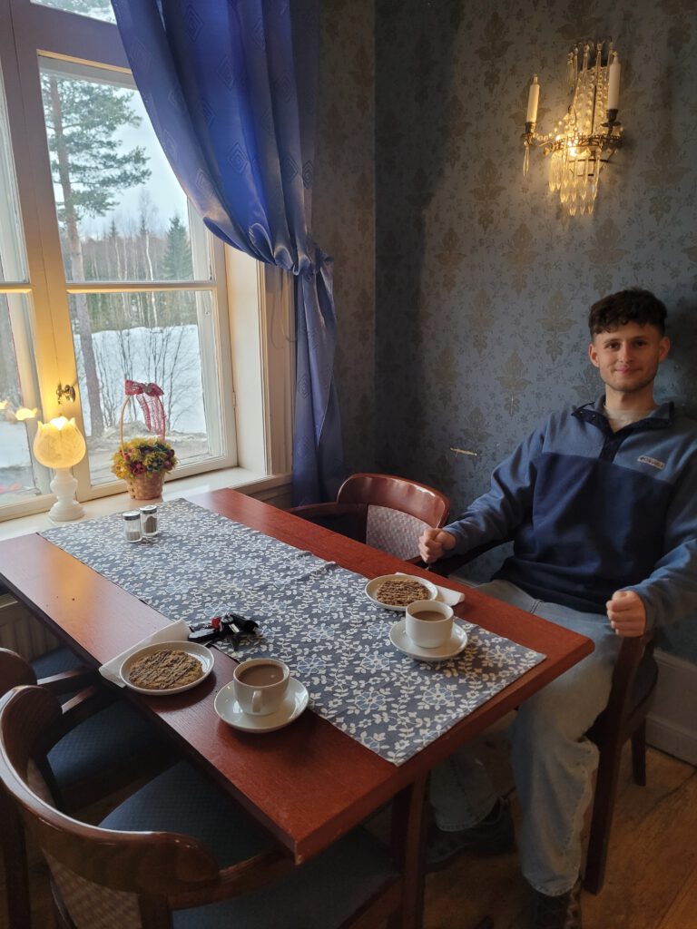 Nach Mora bzw. Orsa ging es wieder höher hinaus und damit war wieder mehr Winterlandschaft und die Gegend wurde immer einsamer. Aber keine Spur von Elchen, nur gedruckte oder gemalte auf Schildern verschiedenster Art. Und da war ja noch der Wunsch nach einer Fika. Wir hatten es schon fast aufgegeben, nach stundenlanger Fahrt durchs Nirgendwo. Und dann plötzlich in einer kleinen Ortschaft, Kårböle, steht es, das Värdshuset Pilgrimen und es ist „öppet“, also nix wie rein. Ja und dann trinken wir unseren Kaffee in einem Raum in dem auch König Carl XVI. Gustaf gespeist hat, wie Fotografien an den Wänden beweisen.