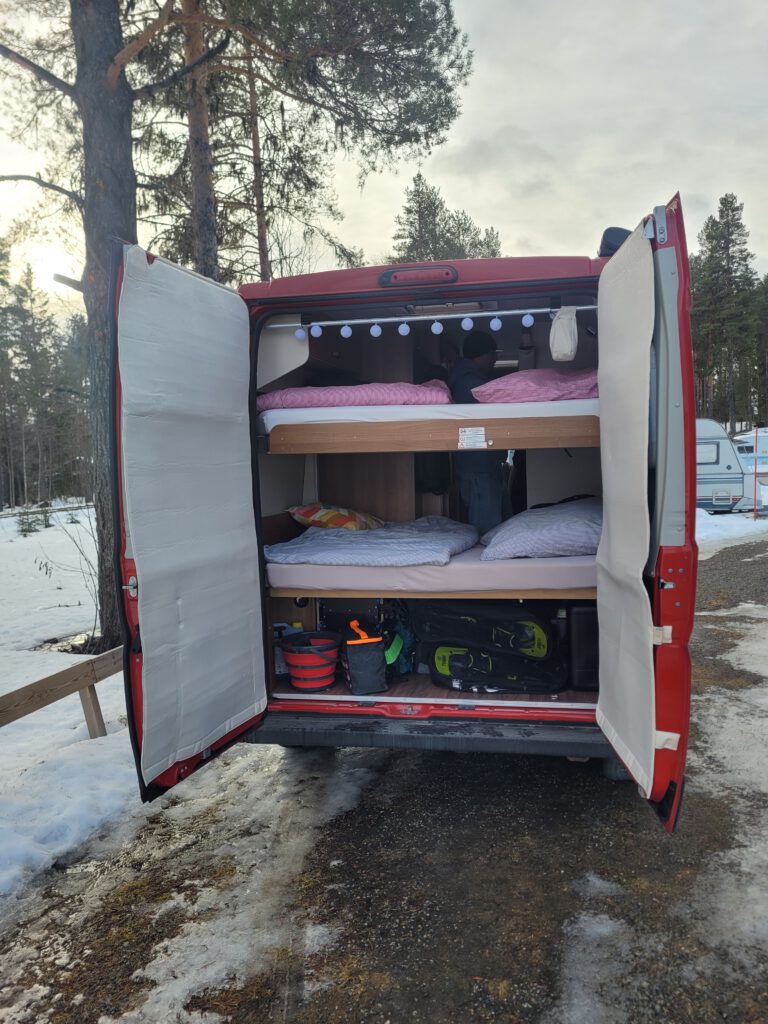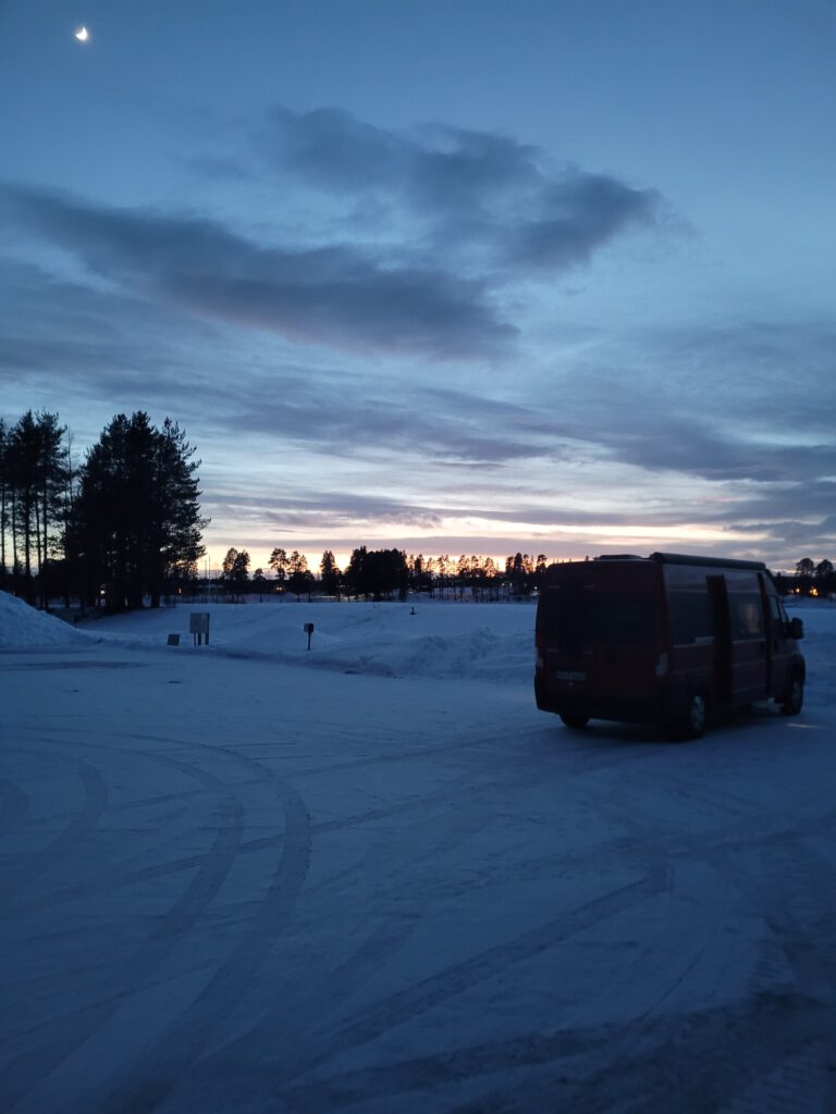 Unser heutiges Ziel ist der Campingplatz in Storuman. Der Platz ist wunderschön direkt am gleichnamigen See gelegen. Wir wählen einen Platz am Ufer hinter einem kleinen Wall mit freier Sicht über den See. Die Verdunkelung der Frontscheibe bleibt offen, vielleicht gibt es schon Polarlichter zu sehen. Zum Abschluss des Tages gönnen wir uns noch einen Saunagang. Schön war der Tag!