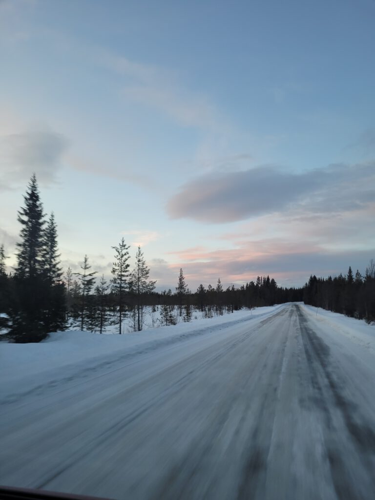 Immer weiter ging es auf dem Inlandsvägen mit häufig wechselnden Wetterbedingungen. Nach einer Mittagsrast in Strömsund und anschließender Weiterfahrt, schlägt das Wetter kurz hinter Hoting um. Im Rückspiegel noch Sonnenschein, vor uns eine graublaue Wolkenwand, die uns auf den folgenden Kilometern mehrfache Schneeschauer beschert. Bei Temperaturen von +4° bleibt allerdings auf der Straße kein Schnee liegen. Das ändert sich als wir die Grenze der Provinz Jämtland hinter uns lassen und nun durch die Provinz Lappland fahren. Zwischen Dorotea und Vilhelmina sinkt die Temperatur von +4° auf 0° und jetzt bleibt der Schnee auch auf der Straße liegen. Wir sind im Winter angekommen, die Schneedecke links und rechts der Straße ist geschlossen – eine karge Landschaft, immer wieder unterbrochen von Birkenwäldern, verwöhnt unsere Augen. Die Straße ist von Schnee und Eis bedeckt.