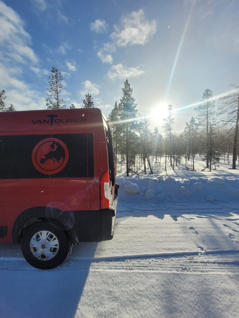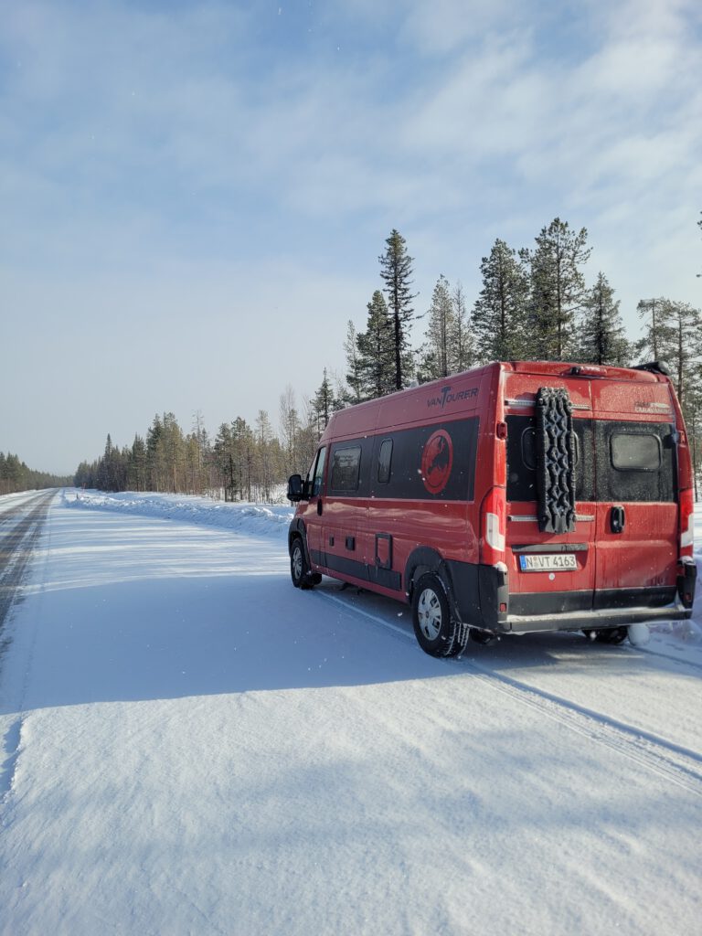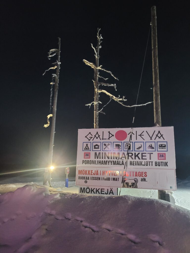 Es ist spät geworden und im Dämmerungslicht sehen wir noch ein paar Rentiere und erreichen das Ziel Galdotieva um 17:00 Uhr. Das liegt im Nirgendwo und ist Tankstelle, Bar, Restaurant, Minimarket und Campingplatz in Einem. Bis 19:00 Uhr gibt’s Essen, die Sauna ist für Männer von 19:00 – 21:00 geöffnet. Wäre da nicht die von uns vergessene Zeitumstellung, es war 18:00 Uhr Ortszeit als wir dort ankamen, hätten wir es ruhig angehen lassen können. Jetzt hatten wir plötzlich doch etwas zeitlichen Stress. Vor allem, weil nicht alle Standplätze vom Schnee geräumt waren. Vor uns waren schon zwei Reisemobile vor Ort, des Weiteren zwei Pickups mit Anhängern für Skidoos und dann kam auch noch ein dritter Pickup mit Anhänger. So mussten wir die Fahrzeuge umparken und umschichten. Wir haben es dennoch hinbekommen. Nach dem Abendessen wissen wir jetzt auch, dass auf dem Bier zu meinem Rentiergeschnetzelten eine Alko-Steuer von 25,5 % erhoben wird und damit eine kleine Flasche (0,33 cl) leckeren finnischen Biers 8 € kostet. Bei dem abschließenden Saunagang konnten wir uns dennoch schon wieder entspannen.