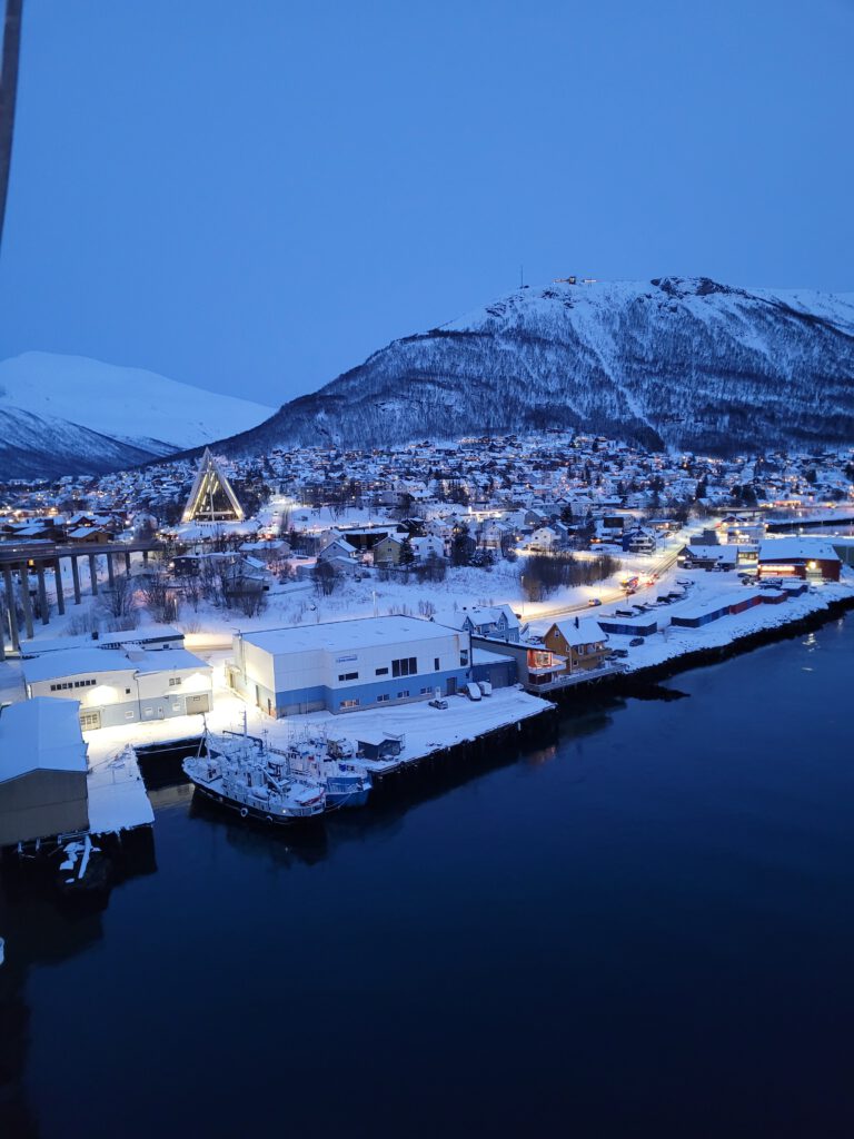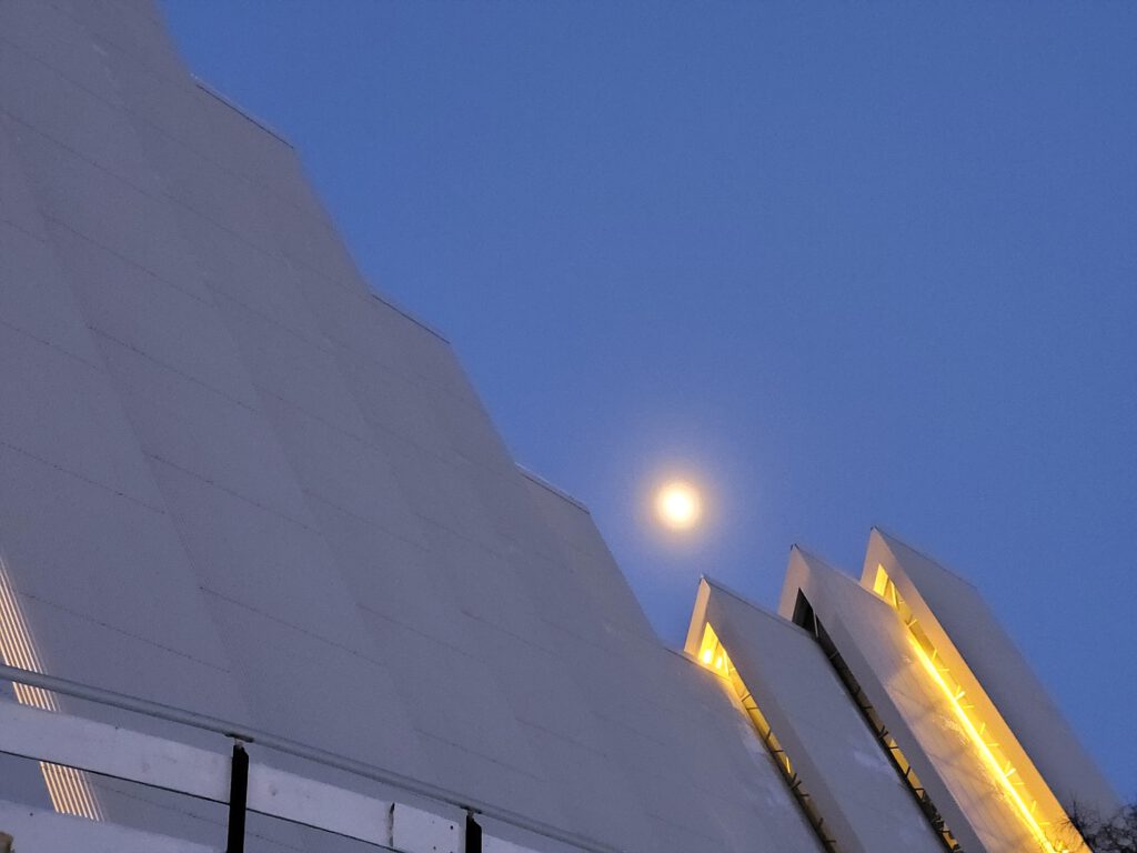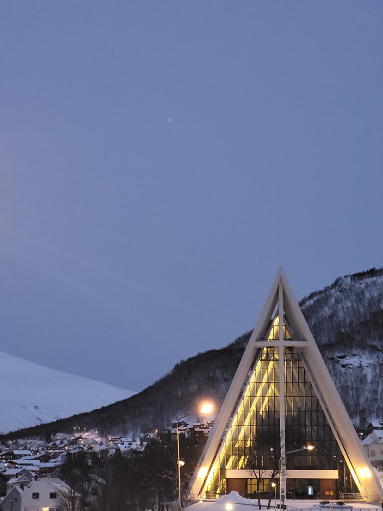 Wir stehen heute Nacht in Tromsø, genauer in Tromsdalen – Tromsdalen ist ein Stadteil von Tromsø und liegt östlich des Tromsøsund auf dem Festland und ist über die 1036 m lange und 36 m hohe Tromsøbrua mit der Insel Tromsøya verbunden. In Tromsdalen befindet sich auch die schon 1965 erbaute Ishavskatedralen – die Eismeerkathedrale. Die Ishavskatedralen ist schon auch eindrucksvoll, wir finden aber die Nordlyskatedralen in Alta vermittelt eine angenehmere Atmosphäre, wir fühlten uns dort einfach wohler.