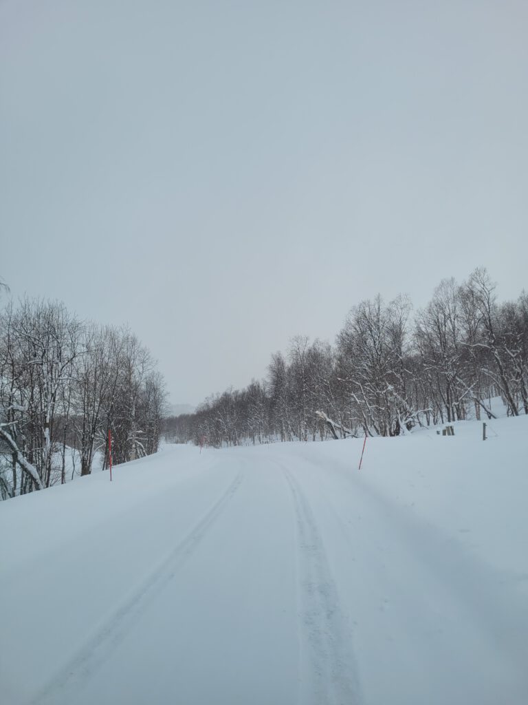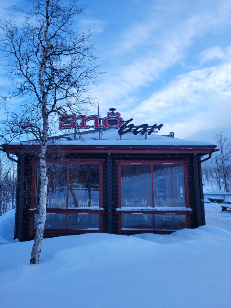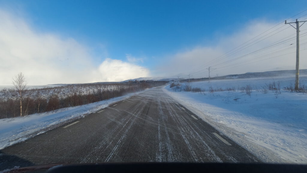 Mit der Überquerung der Grenze änderte sich auch die Farbe der Fahrbahnbegrenzungs- und Schneepflugorientierungsstangen von rot auf neongelbgrün – dauert bis sich die Augen an diese giftige Farbe gewöhnen – und gefühlt fehlte uns an einigen Stellen der Route der in Norwegen öfters eingesetzte Streusplit (dazu gleich mehr). Werbetafeln entlang der Fahrstrecke versprachen uns eine Essensmöglichkeit in Björkliden, einem großem Skigebiet neben der E10 mit einer Skihütte die laut Google Maps ganz ansehnlich zu sein schien.