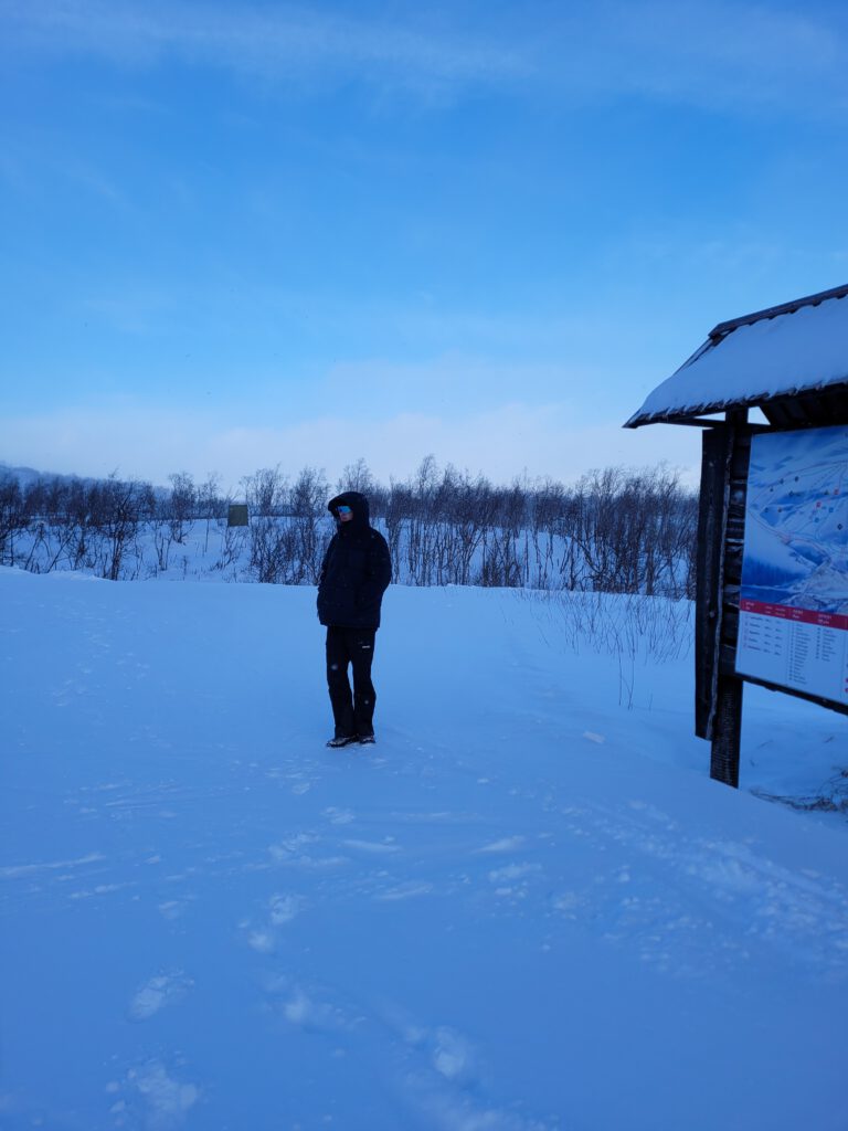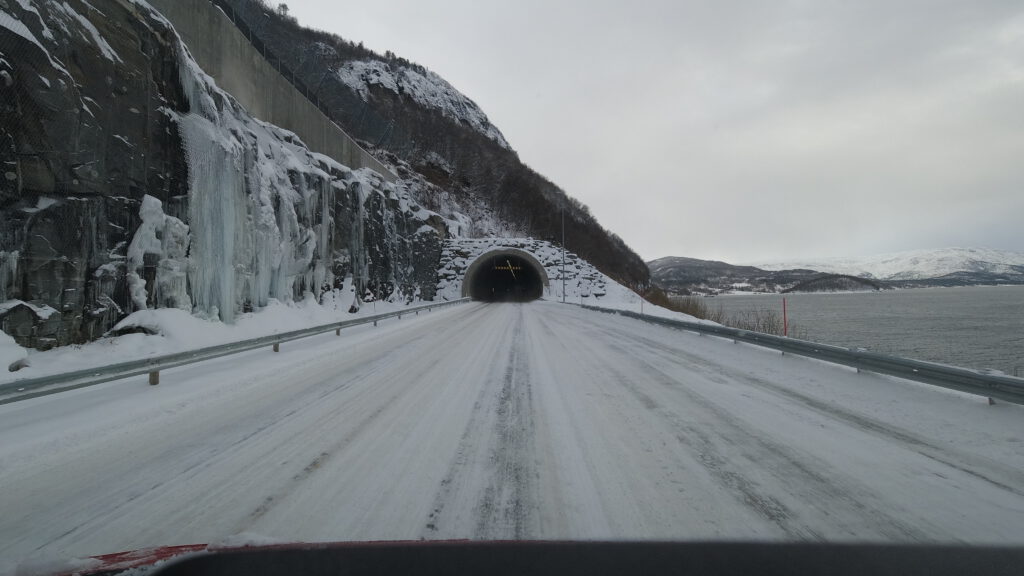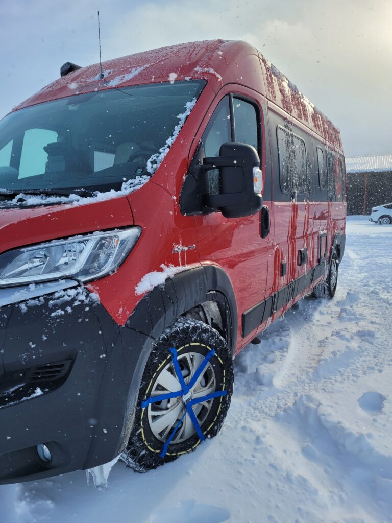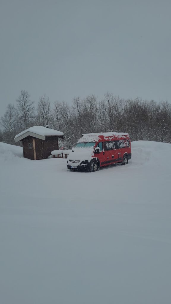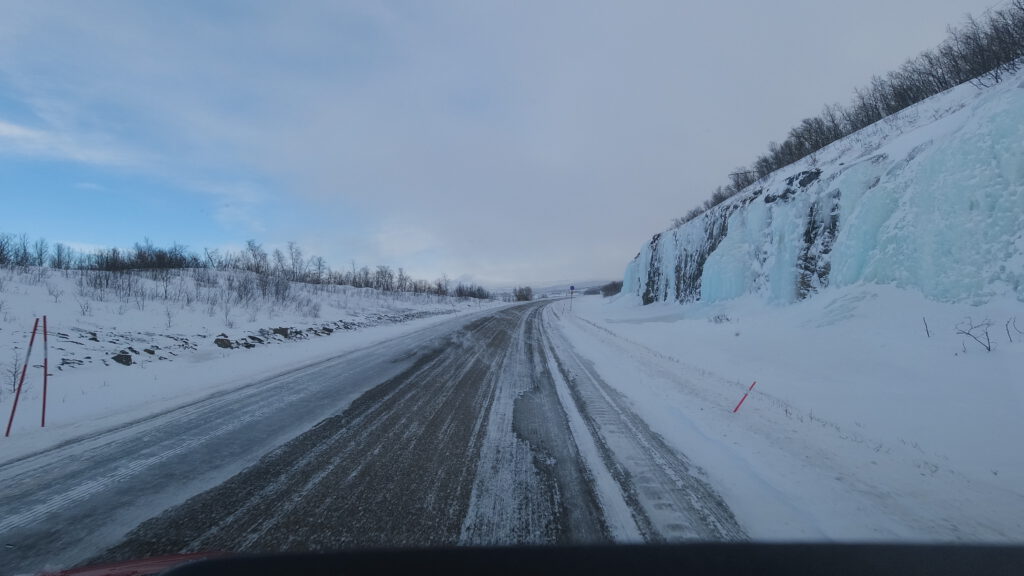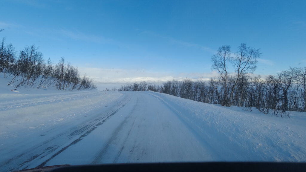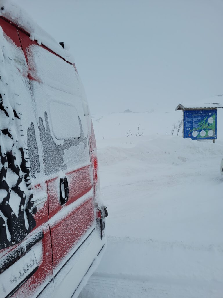 Wir verließen also die E10 und hatten einen langen Anstieg vor uns. Auf halber Strecke stellte sich heraus, dass der Hochtrieb schwächer als der Abtrieb war, denn es fehlt der norwegische Streusplit! Also fuhren wir wieder rückwärts runter bis kurz vor die Einmündung der E10 und suchten nach einer Lösung: Würden wir für die Möglichkeit in einer urigen Hütte etwas Leckeres zu essen zu bekommen, Schneeketten aufziehen wollen oder lieber nicht? Neben Stahlschneeketten haben wir noch Textilschneeketten, auch Scheesocken genannt, an Bord. Da wir neugierig sind und Schneesocken noch nie eingesetzt hatten, haben wir diese montier. So ging es dann tatsächlich problemlos die Straße hinauf bis zum Parkplatz der Talstation. Nach einem 10-minütigen Fußmarsch haben wir die Skihütte erreicht. Aber Überraschung – ein Schild verriet uns: Stängt (Geschlossen)! 🤬 Also blieb uns nichts weiter übrig, als wieder hinunter zu fahren, die Schneesocken auszuziehen und in Richtung unseres heutigen Ziels Abisko zu fahren.