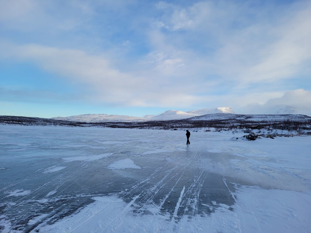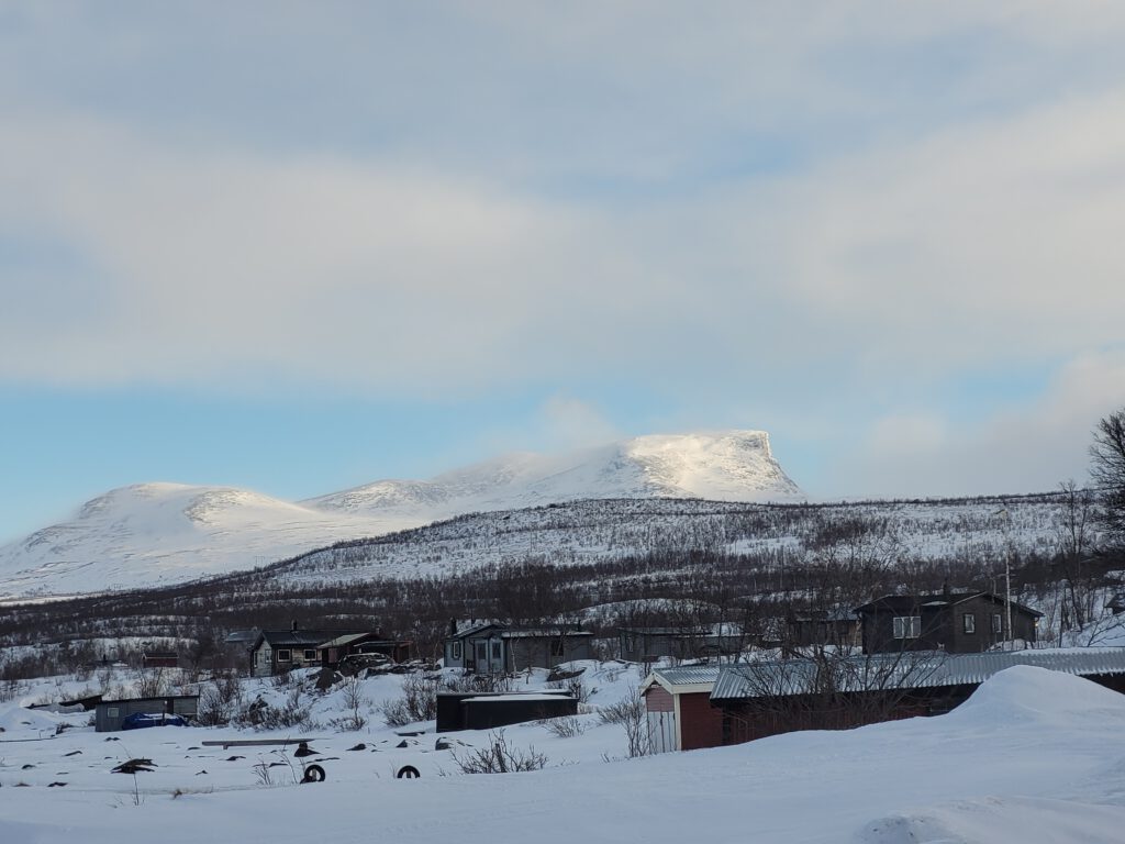 Die Route über Abisko haben wir gewählt, weil dies der trockenste Ort in ganz Schweden und daher die Wahrscheinlickeit eines wolkenlosen Himmels sehr hoch ist. Leider war dies aber heute nicht der Fall. Polarlichter werden wir daher voraussichtlich heute Nacht nicht sehen können. Morgen wollen wir in den Abisko Nationalpark reinlaufen und hoffentlich auch das Panorama von Lapporten – einem imposanten Trogtal im Gebirgszug – sehen. Abisko liegt unmittelbar am Torneträsk, einem großen See, der momentan total zugefroren ist. Er trägt nicht nur uns sondern auch Skidoos und deren vollbeladene Anhänger. Es muss hier also bereits seit längere Zeit ziemlich kalt sein. Gerade pfeifft uns ein gefühlt -20°C kalter Wind um die Ohren. Das ist ungemütlich, weshalb wir uns doch lieber in unserer kuschelig warmen Wohnhöhle verkriechen.