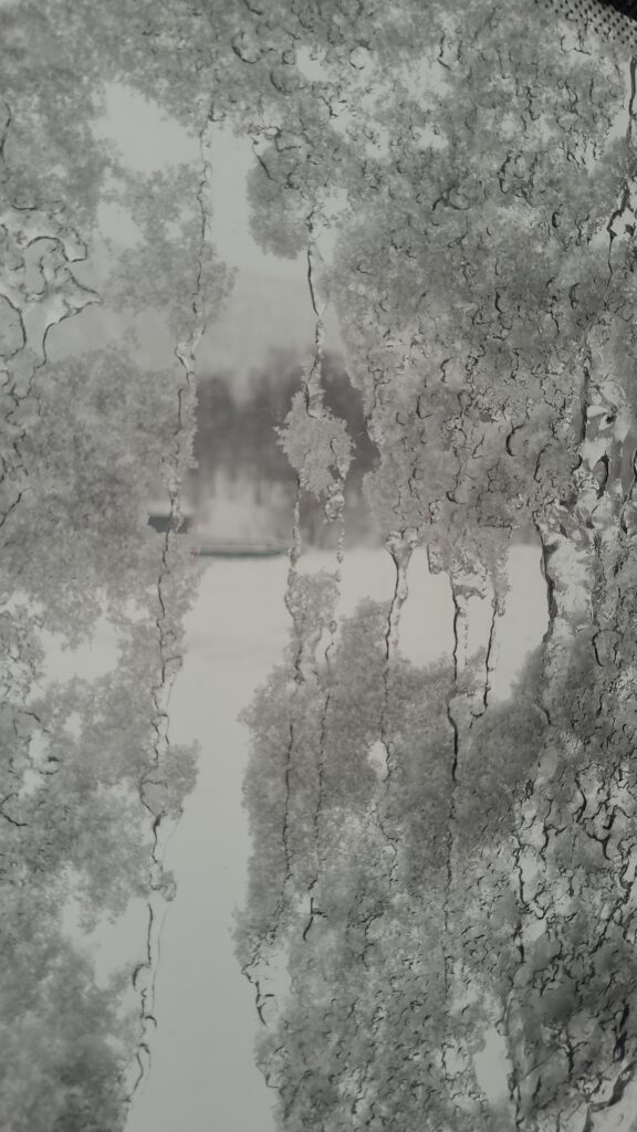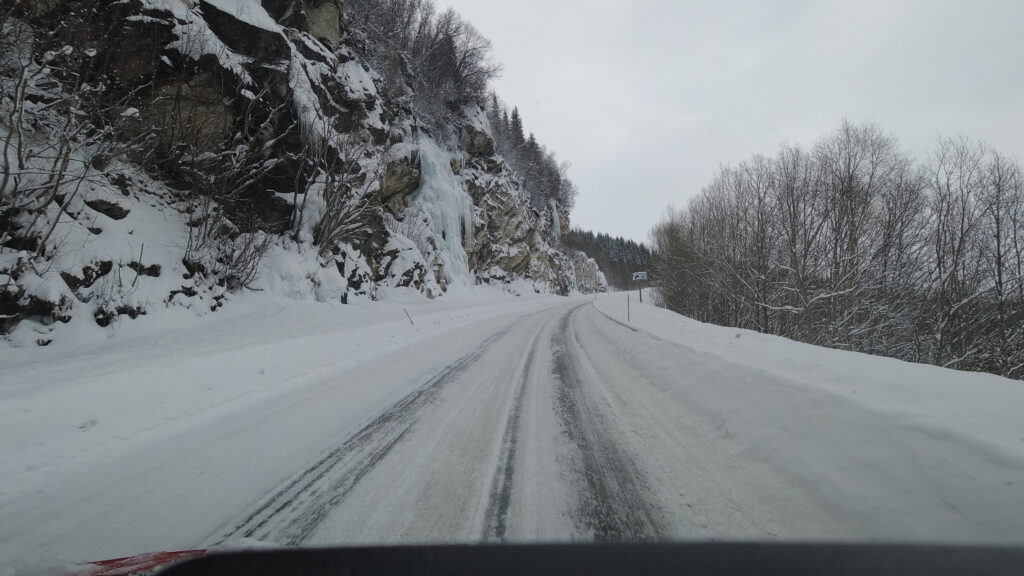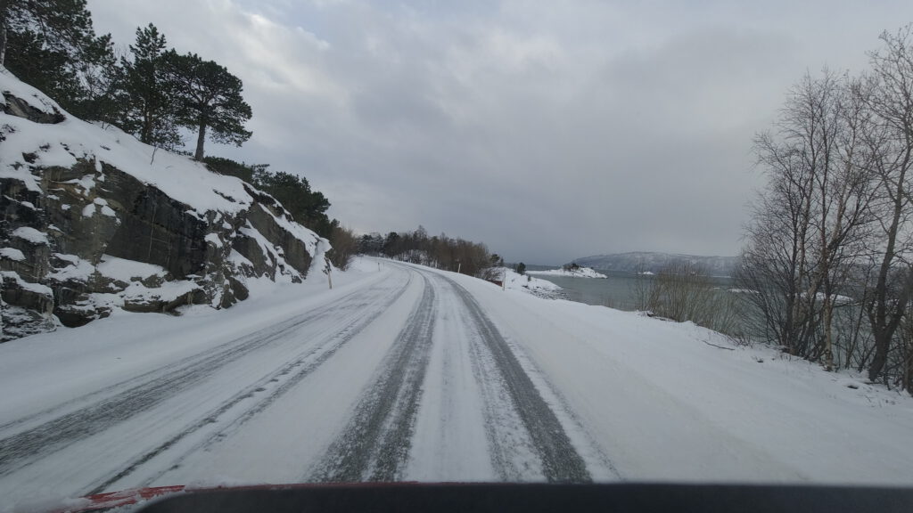 Bevor die heutige Fahrt beginnen konnte, mussten wir allerdings erst den vom Schneepflug vor der Ausfahrt angehäuften Schneewall wegschaufeln. Mit unseren eigenen Schneeschaufeln, die wir auch vorsorglich dabei hatten. Zum Glück; auch weil es in Norwegen Pflicht ist, im Winter eine Schneeschaufel mitzuführen!