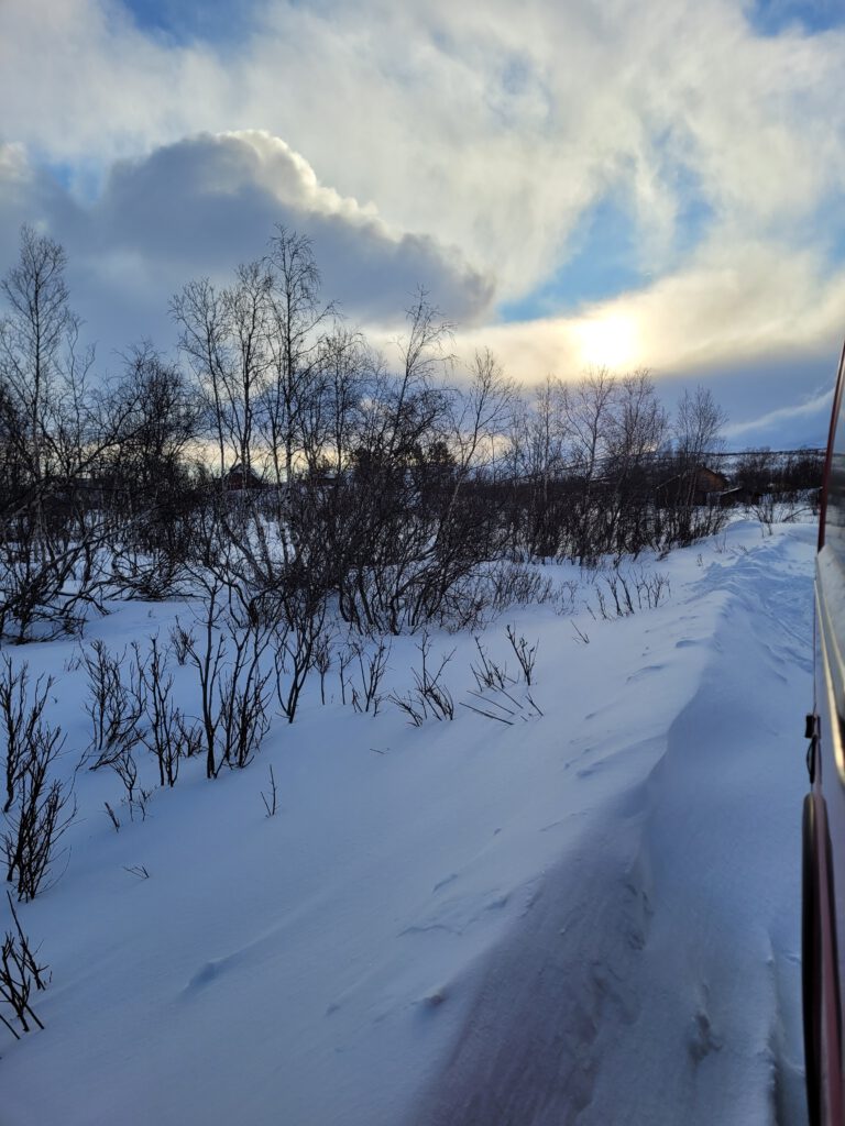 Was es in Absiko leider nicht gibt: einen Wohnmobilstellplatz; sowohl am STF als auch am großen Parkplatz der Bahnstation ist das Übernachten im Wohnmobil untersagt. Daher standen wir ein paar Kilometer weiter an einer Zufahrtstrasse zu einem privaten Campingplatz (Trailerpark) und einem Hüttenareal am Ufer des Torneträsk. Für eine Nacht war das ok.
