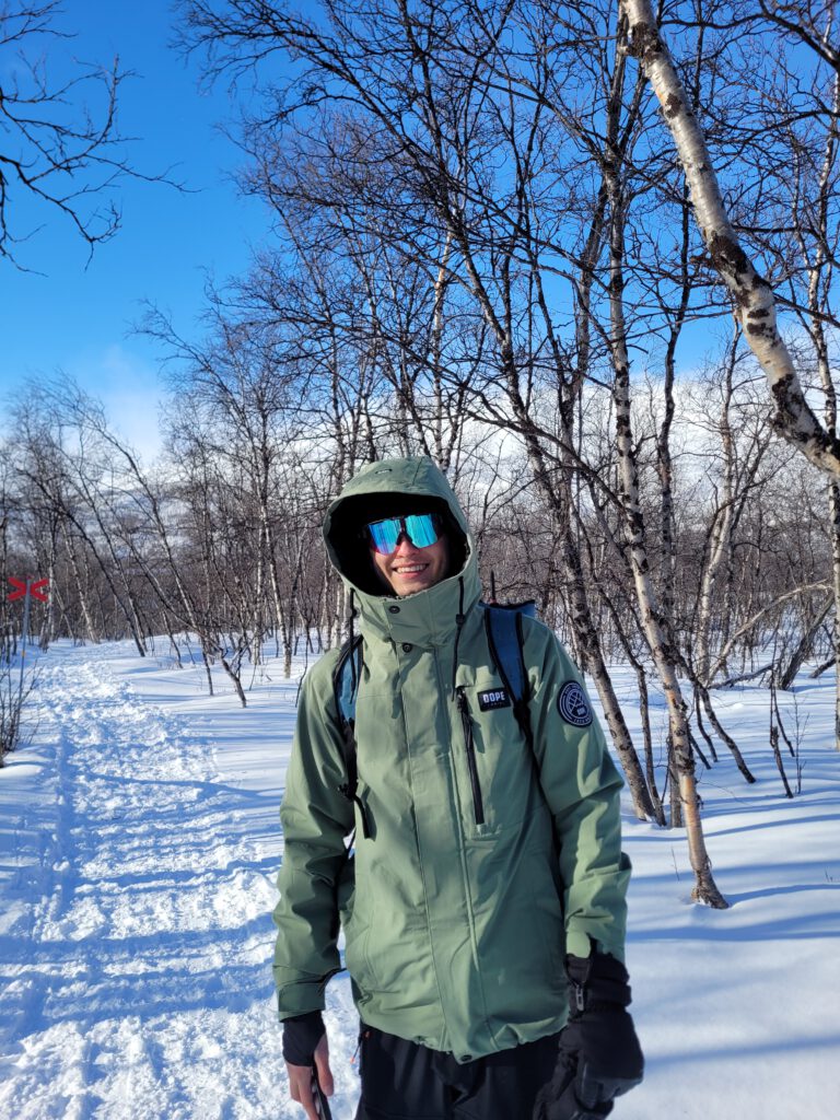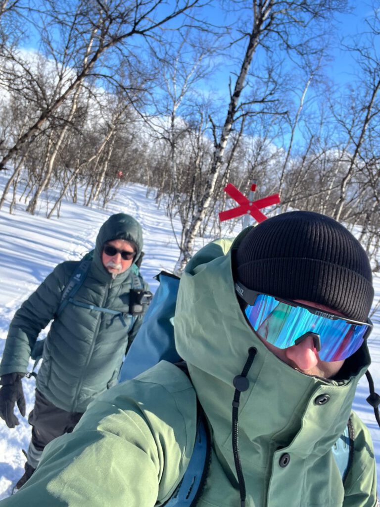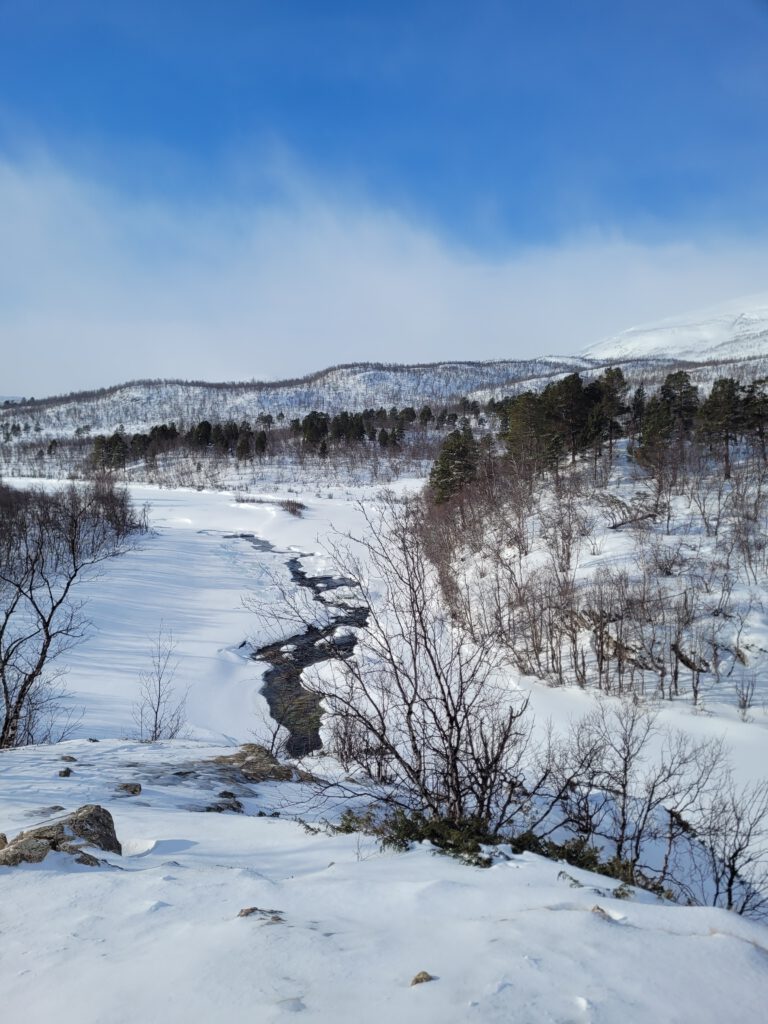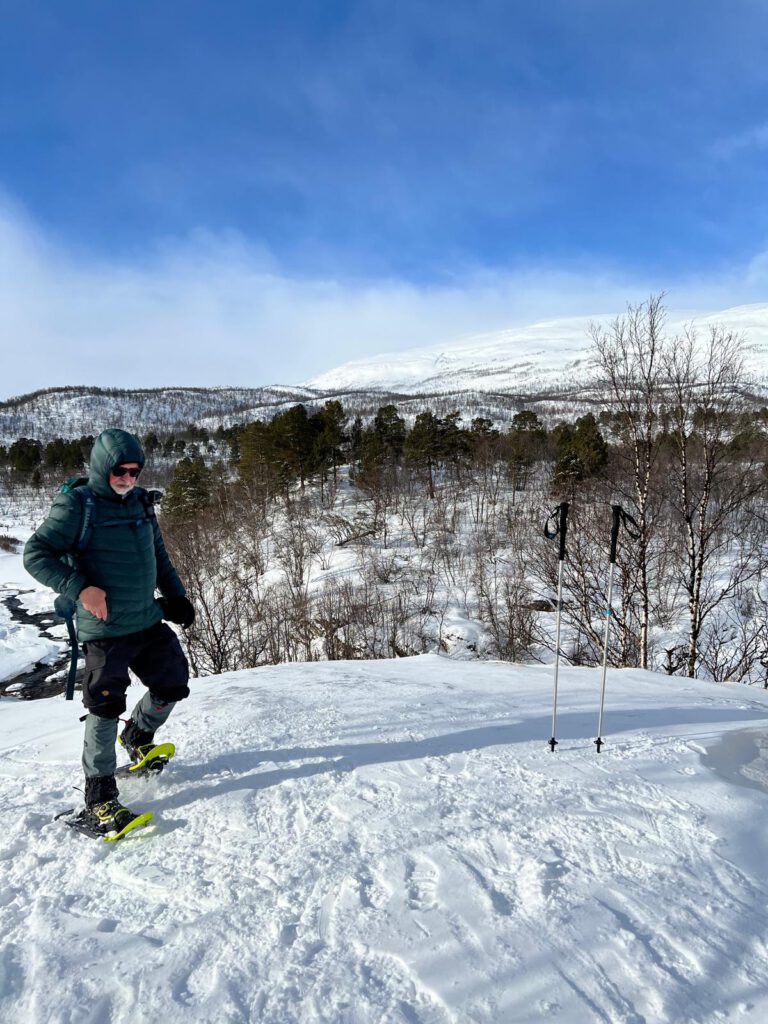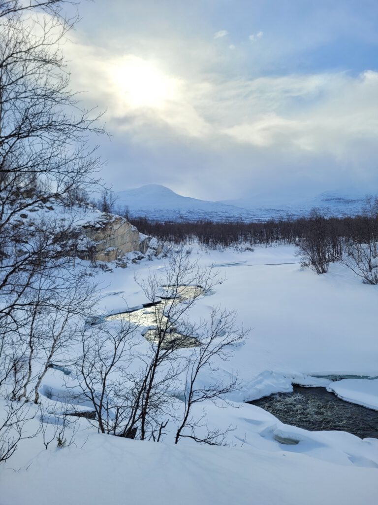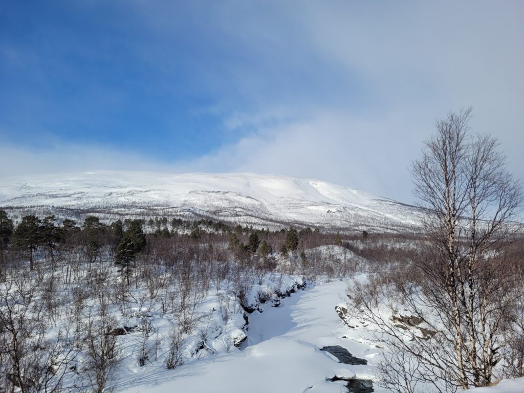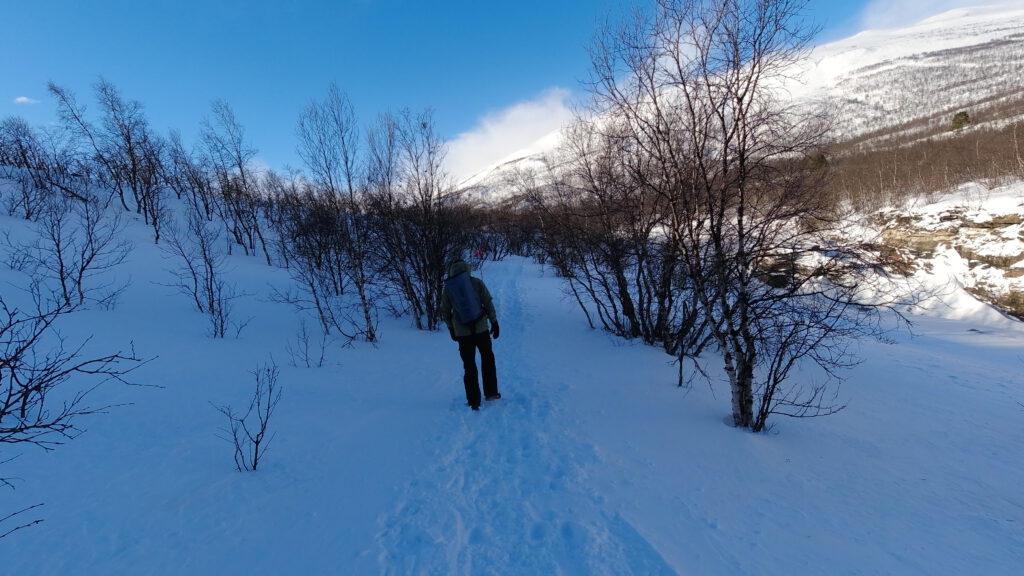 Waren es am Einstieg zu unserem und anderen Trails noch mehrer Gruppen, wanderten wir bald für uns. Es ging durch Birkenwälder, entlang des meist zugefrorene Gorsahjoka rechts von unserer Strecke. Der Weg war sowohl von Fußgängern als auch von Skilanglaufwanderen gespurt und je nach Schneefestigkeit und Schneehöhe entsprechend tief. Ich habe daher nach etwa 20 Minuten die Schneeschuhe vom Rucksack genommen und sie mir untergeschnallt. Von da an war es weniger anstrengend und vor allem auch trittsicherer. An windexponierten Stellen des Weges war es nämlich auch eisig.