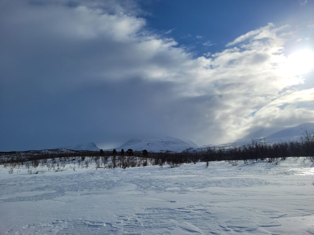 Elias hat für uns einen Rundweg im Abisko Nationalpark ausgesucht, der uns zunächst dem Kungsleden – einem rund 470 Kilometer langen Fernwanderweg in schwedisch Lappland bzw. Sápmi – folgen lässt, um dann zum Njakajaure, einem kleinen See, abzuzweigen und uns auch den Blick zum Lapporten, einem Trogtal südöstlich von Abisko, ermöglichen soll. Auf dem Rückweg ging es dann über Gebirgsheide und Permafrostböden.