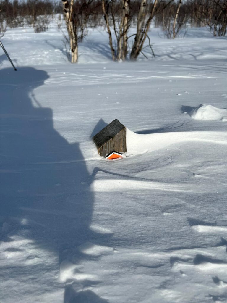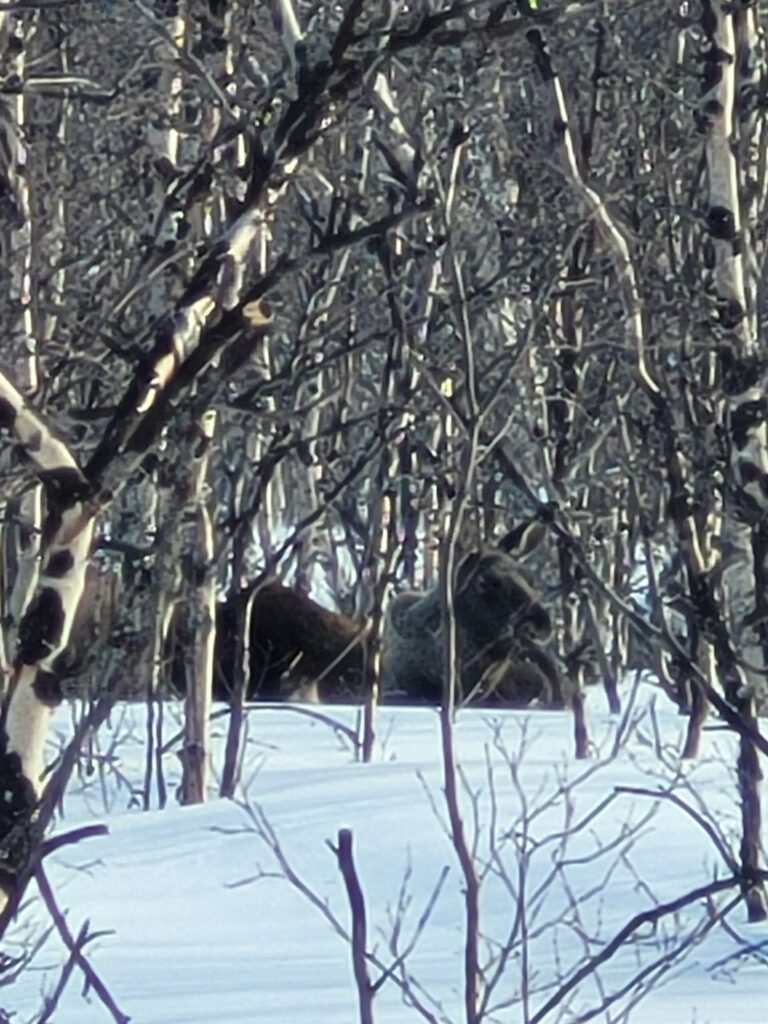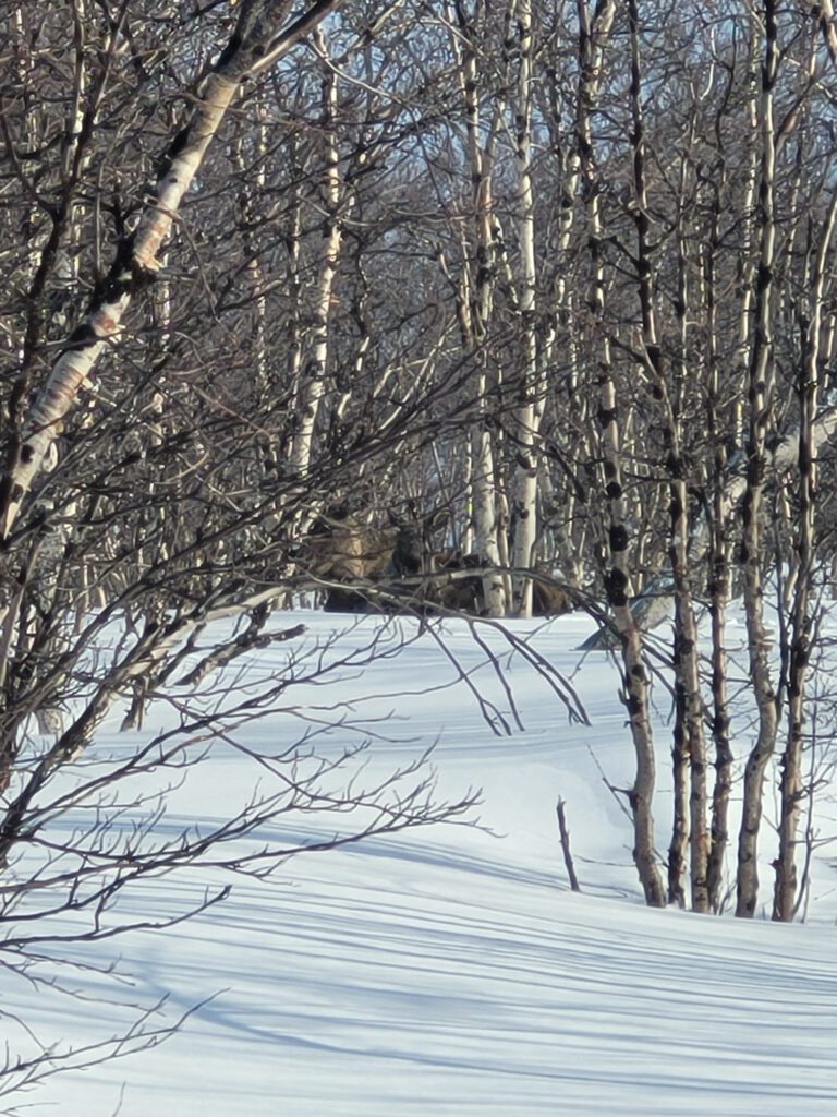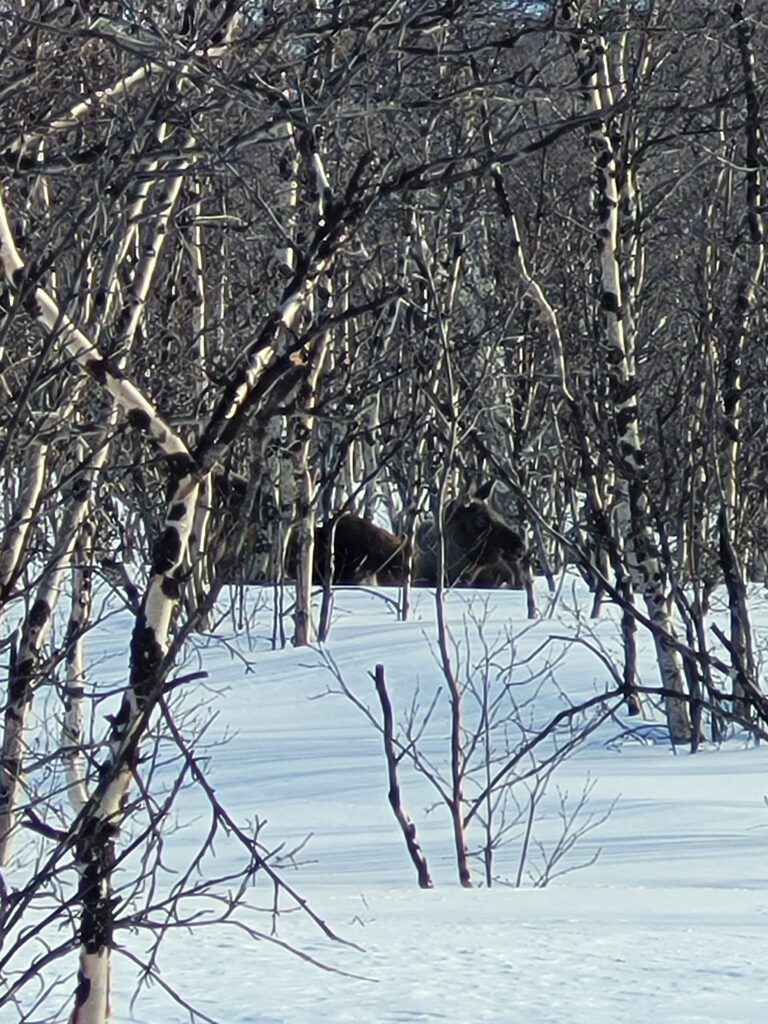 Ein Highlight auf unserer Tour erwartete uns auf dem Rückweg durch die karge Landschaft des Permafrost: ca. 100 Meter von uns entfernt lagen zwei Elche versteckt im lichten Birkenwald. Wenn nicht ein junges schwedisches Pärchen vor uns diese entdeckt hätten, wären wir wohl vorbei gegangen ohne diese zu bemerken. Die Moose waren ohne Geweih und daher weiblich, vermutlich eine Kuh und deren schon großes Kalb. Wir freuen uns endlich auch Elche in freier Wildbahn gesehen zu haben. Da war es dann gar nicht mehr so schlimm, dass uns auf dem weiteren Rückweg ein eisiger Wind von schräg vorne ins Gesicht bließ. Nach gut 2,5 Stunden waren wir zurück am Parkplatz der Bahnstation und haben uns am Mittagsbuffet im STF gestärkt.
