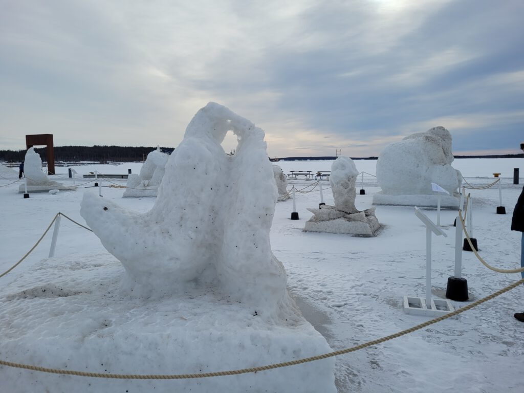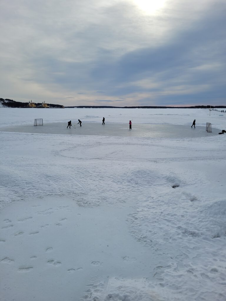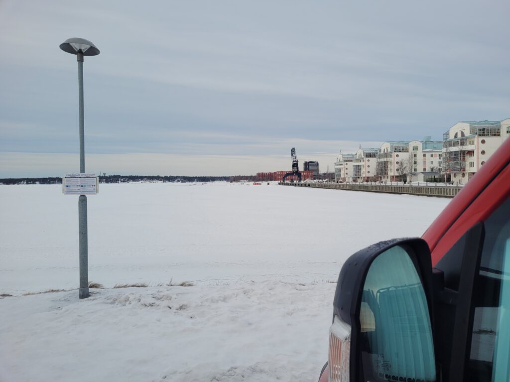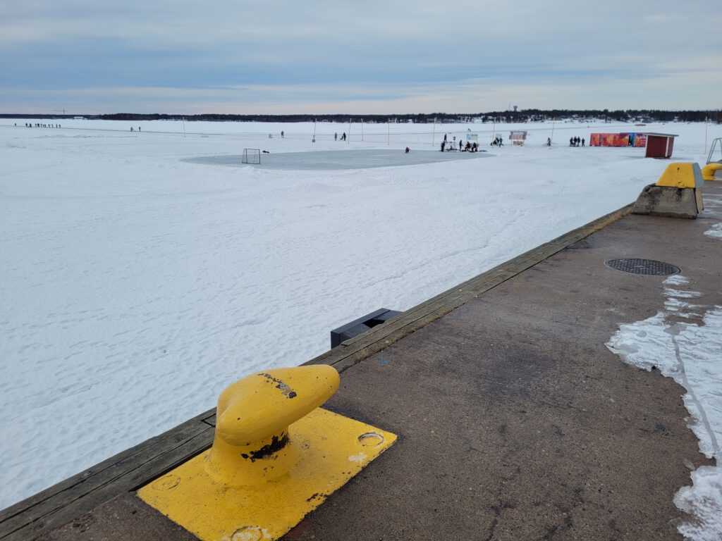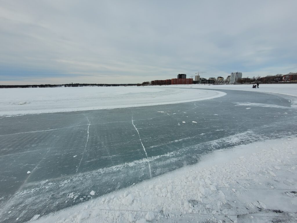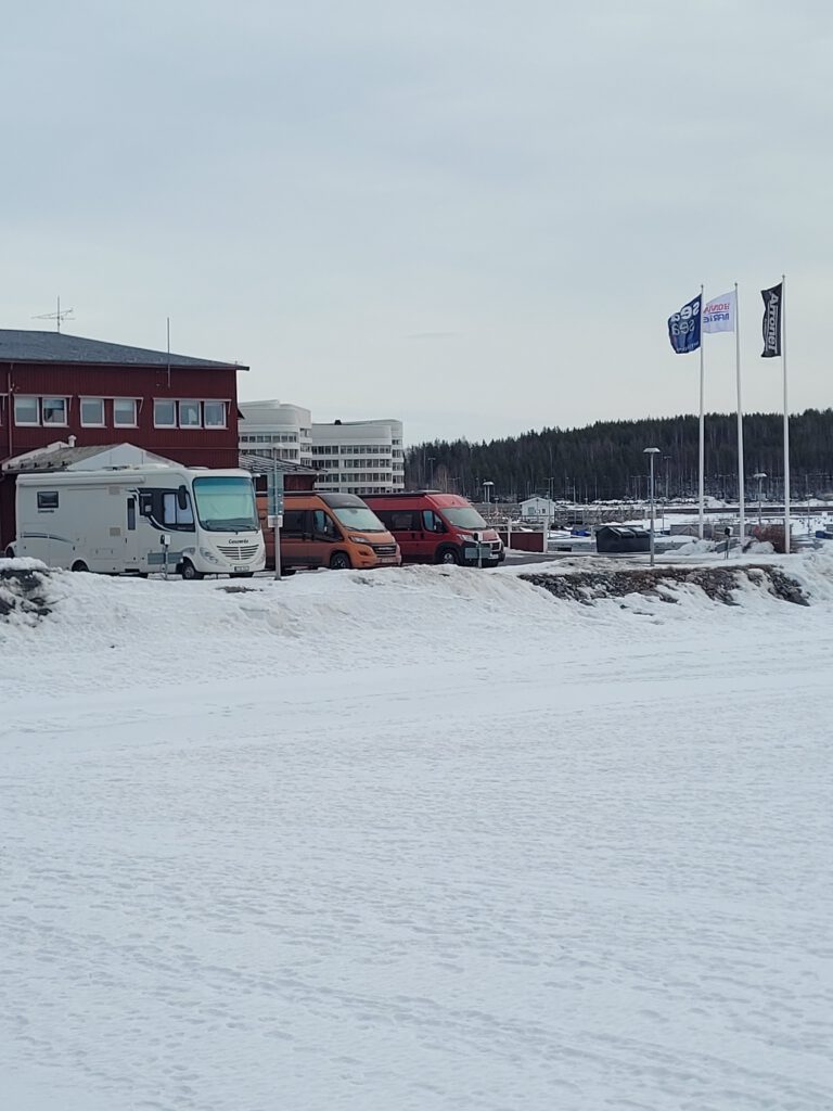 es geht weiter Richtung Süden, nach Umeå. Aber bevor wir losfahren mussten wir uns die gigantischen Eislaufmöglichkeiten auf dem tiefgefrorenen Luleälven anschauen. Leider haben wir keine Schlittschuhe dabei und es gab auch keine Ausleihmöglichkeiten in der Nähe. Gleich am Södra Hamnplan geht’s aufs Eis. Ein Eishockeyfeld, daneben ein Windschutz mit Sitzgelegenheiten und Lagerfeuer, Ausleihmöglichkeit für Kicksled (Tretschlitten) gegen eine Spende – wenn nicht schon alle weg sind – und vor allem eine Eislaufstraße! Insgesamt 10 km sind in dieser Weise auf dem Fluß gespurt. Wäre sicher ein großer Spaß gewesen, wir merken uns es fürs nächste Mal.