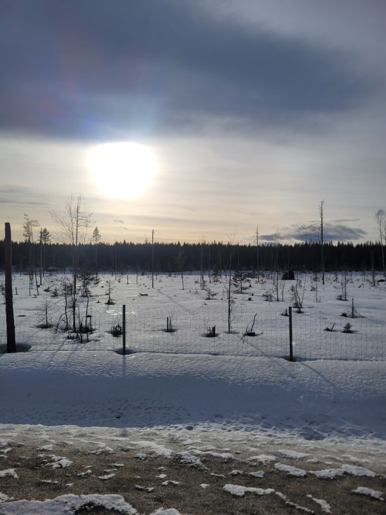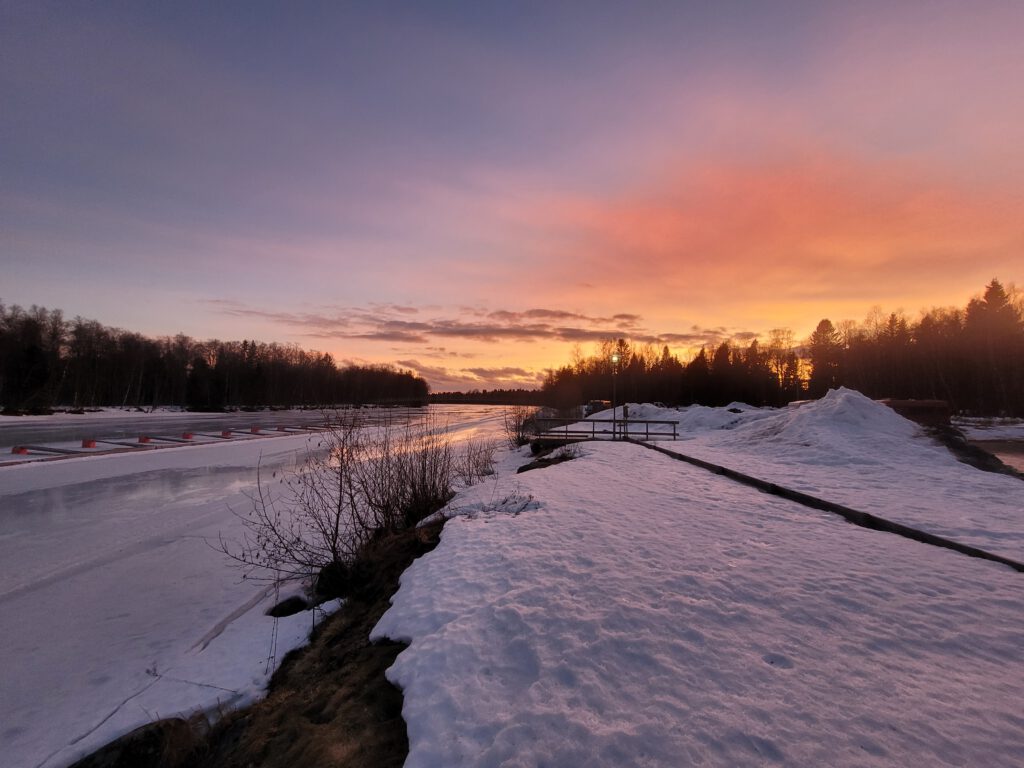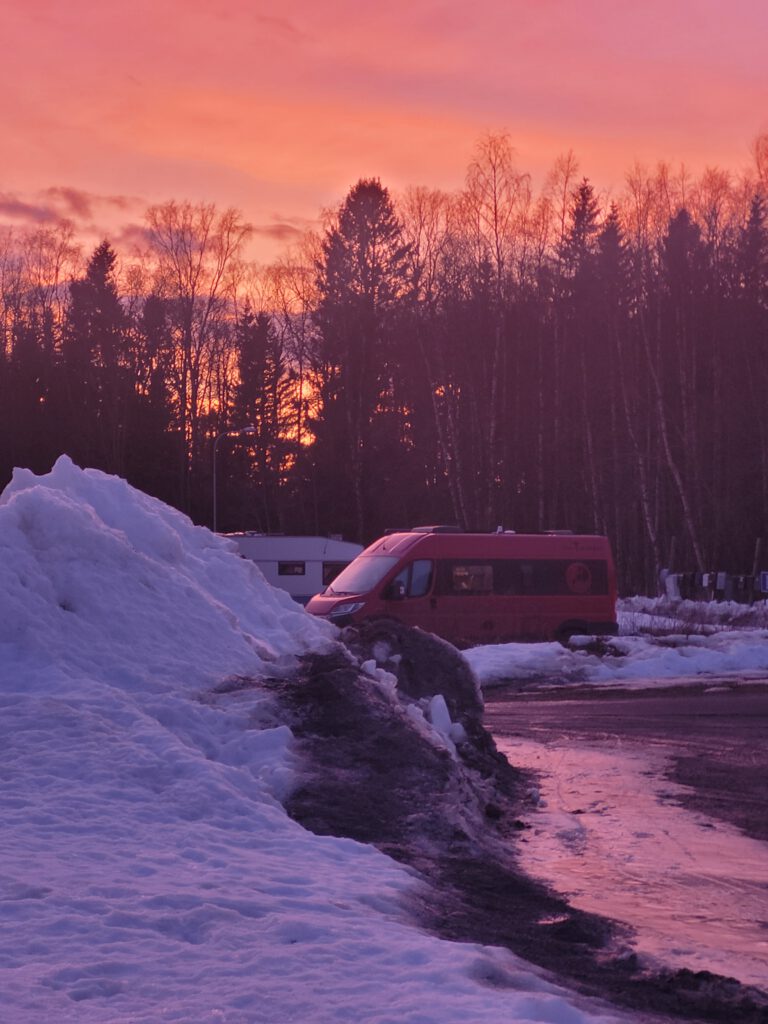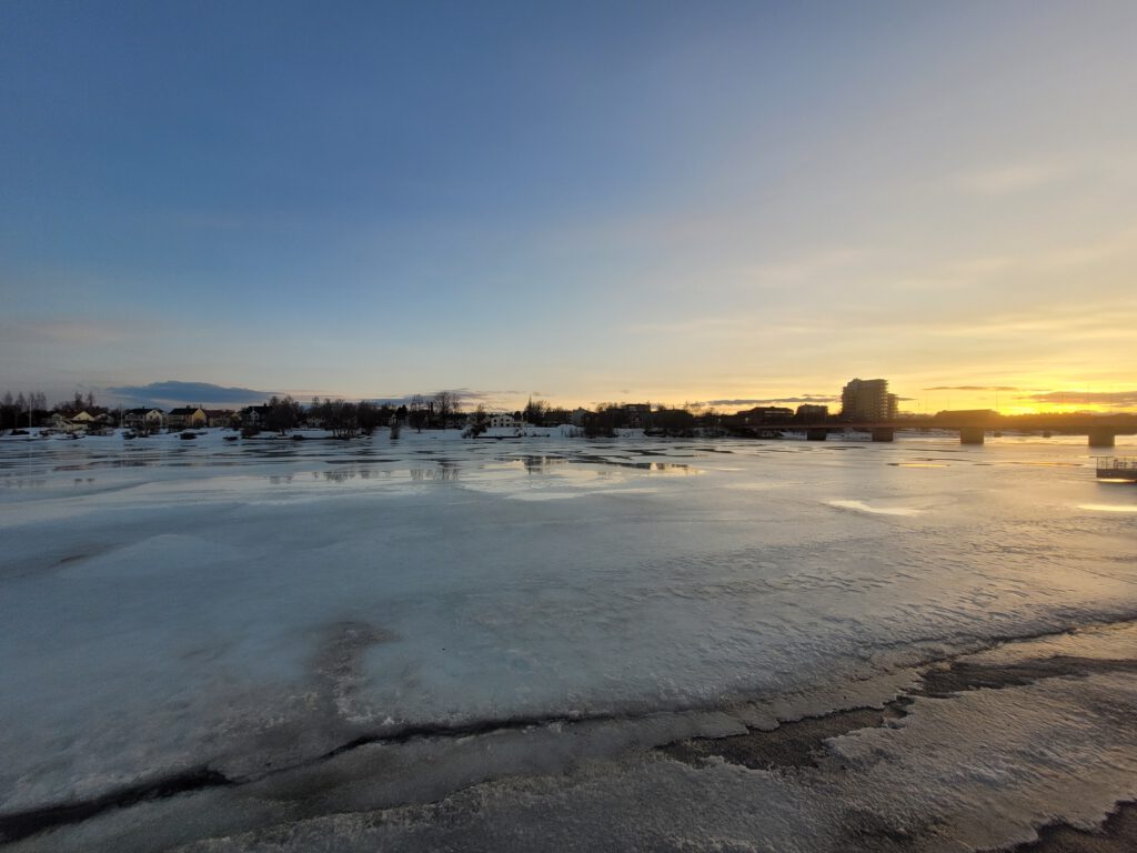 Umeå liegt wie Luleå an einem Fluss, hier ist es, kaum verwunderlich, der Umeälven, auch er ist noch tiefgefroren. Wir stehen heute Nacht weiter Flussabwärts am Stora Tuvan Naturreservat.